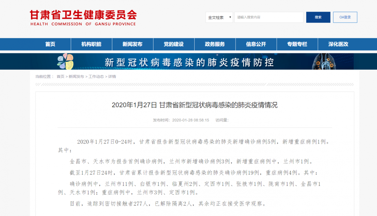 甘肃新增5例确诊病例,累计19例,金昌、天水首现确诊病例