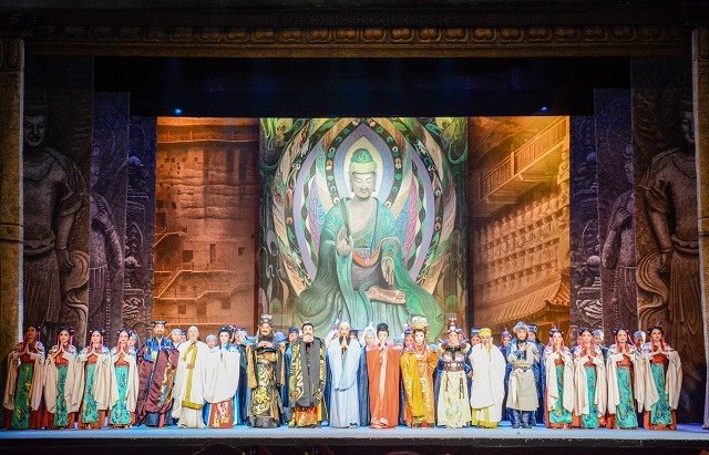 “千载遗石窟,百代事浮图”,在名满天下的麦积山石窟第44号石窟中,有一尊被誉为“东方维纳斯”的坐佛雕像,她那超然的微笑弥漫着春晖般温暖,悲悯的胸怀净化着前来拜谒人们的心灵。6月21日晚,由天水西秦腔艺术剧院联袂甘肃省秦腔艺术剧院、甘肃省陇剧院全新复排演出的大型秦腔历史剧《麦积圣歌》,用一曲凄婉壮美的历史长歌,深度还原这尊雕塑背后的历史故事,为参加2023(癸卯)年公祭中华人文始祖伏羲大典的海内外宾客和天水市社会各界群众献上了一道丰厚的艺术盛宴。