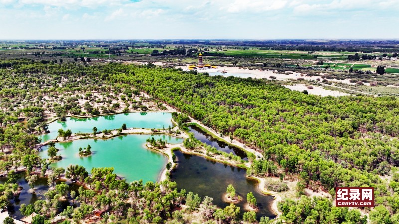 6月23日,金塔沙漠胡杨林景区的万亩胡杨林郁郁葱葱,清澈的湖水、绿意葱茏的胡杨、秀美的水中倒影共同绘成一幅亮丽、绝美的图画,令人陶醉。