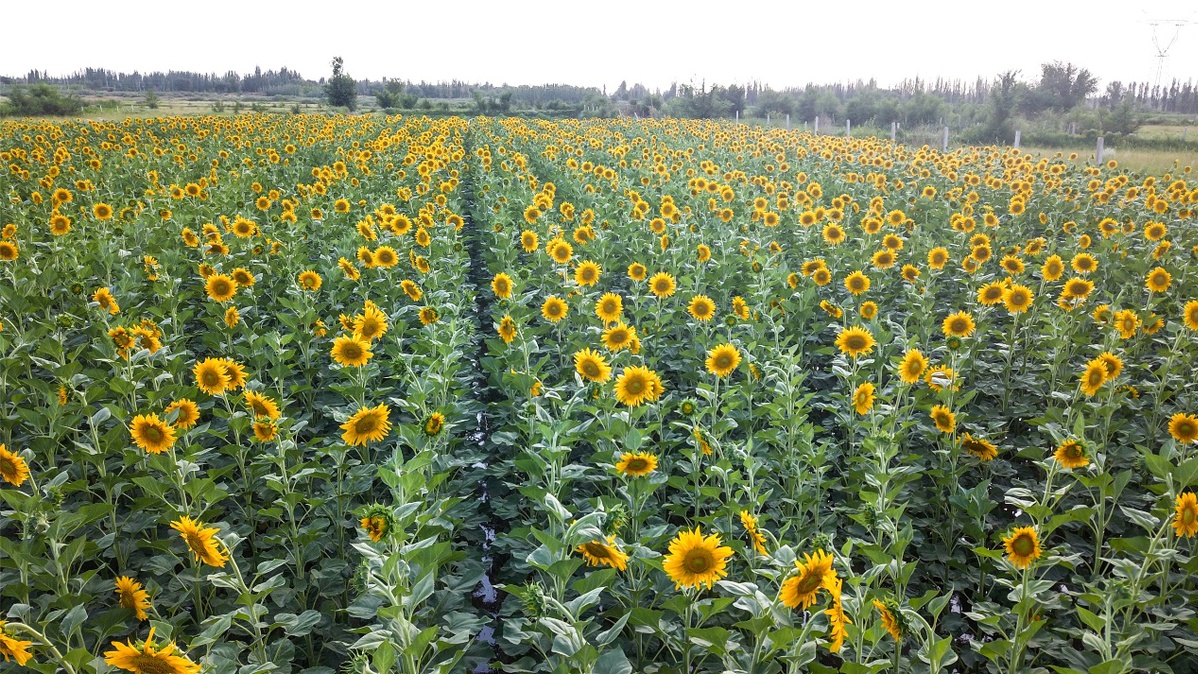 6月24日,甘肃敦煌黄渠镇鸣沙山下向日葵绽放成花海,满目金黄。
