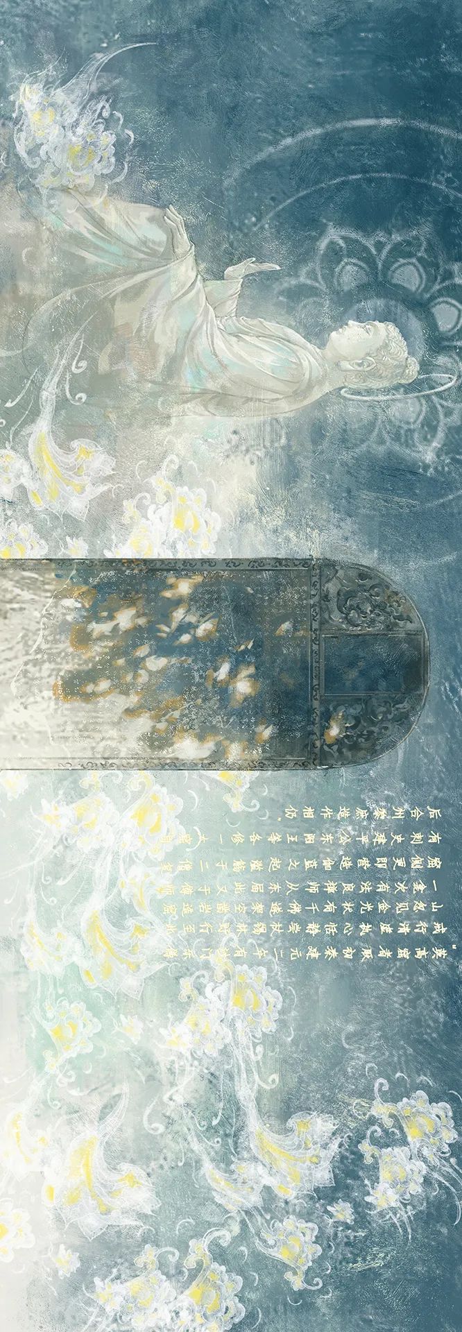 《李君莫高窟佛龛碑》,也称“圣历碑”。碑文中概述了莫高窟营建史并描绘了莫高窟的景色,此碑是敦煌现存最早的一块石碑,也是研究敦煌历史、莫高窟营建的重要资料。以下八张图用数字绘画的形式描绘了《李君莫高窟佛龛碑》中所记载的敦煌莫高窟的诞生过程。构图和色彩都十分具有中国美学韵味,其中的肌理质感更是表现了西域沙漠的苍凉感。