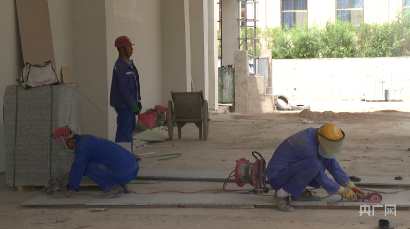 工人正在铺设地砖(央广网发 郭鑫 摄)