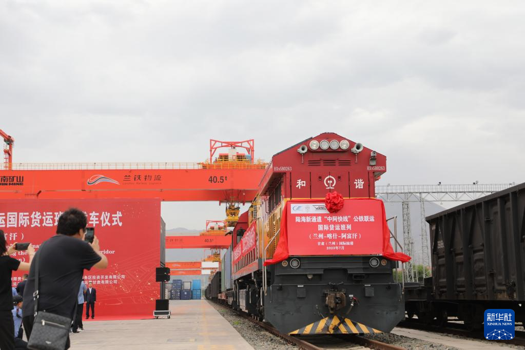 7月5日上午,陆海新通道“中阿快线”公铁联运国际货运班列发车仪式在甘肃(兰州)国际陆港举行。新华社记者 张智敏 摄