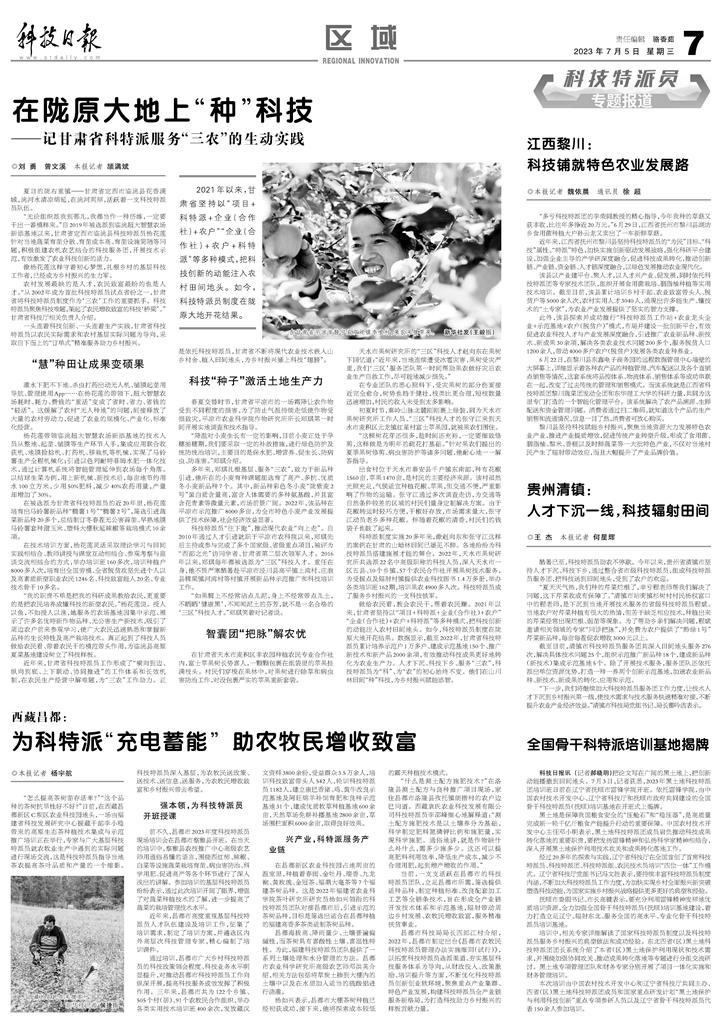 做给农民看,教会农民干,帮着农民赚。2021年以来,甘肃省坚持以“项目+科特派+企业(合作社)+农户”“企业(合作社)+农户+科特派”等多种模式,把科技创新的动能注入农村田间地头。如今,科技特派员制度在陇原大地开花结果。数据显示,截至2022年,甘肃省科技特派员累计培养示范户1万多户、建成示范基地150个、推广新技术和新产品2000余项,有效推动科技成果更好地转化为农业生产力。人才下沉、科技下乡、服务“三农”,科技特派员为“科”、为“农”的初心始终不变。他们在山川林田间“种”科技,为乡村振兴赋能添智。