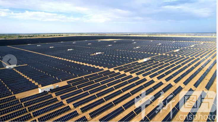 2023年7月5日,航拍甘肃省酒泉市金塔县红柳洼光电产业园,一排排光伏太阳能发电板排列整齐,形成了一望无际的蓝色“光伏海洋”,蔚为壮观。