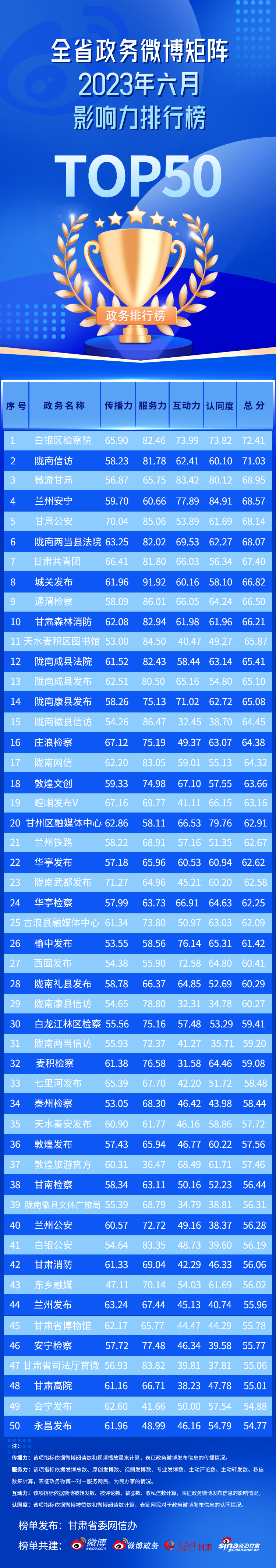 2023年6月,政务微博影响力TOP10的账号分别为@白银区检察院、@陇南信访、@微游甘肃、@兰州安宁、@甘肃公安、@陇南两当县法院、@甘肃共青团、@城关发布、@通渭检察、@甘肃森林消防。从影响力上看,@陇南武都发布 传播力最高,@城关发布 服务力最高,@兰州安宁 认同感最高,@微游甘肃 互动率最高。
