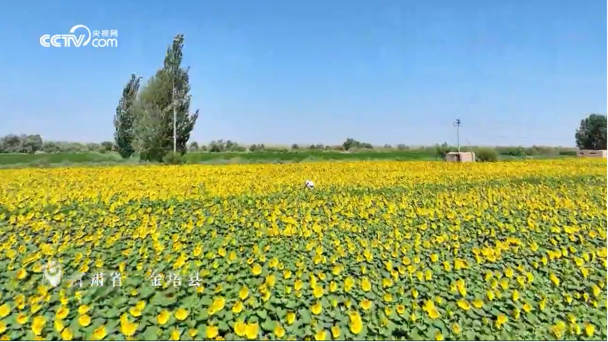 7月9日,甘肃省金塔县双树村的制种向日葵在阳光下竞相绽放,葵农穿梭在花海间忙着授粉。