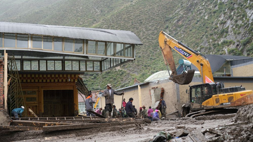 夜晚漆黑一片,强降雨仍在持续。村里的排洪渠已被阻塞,大量沙石泥水向四处涌来。搜救人员手拉手趟过泥水,每走一步都得用尽全身力气。在经过艰难跋涉后,他们终于将被困在工棚中的多名工人陆续营救出来,其中7人受伤。另有2人遇难、2人失联,搜救人员又投入到寻找失联人员的工作中。
