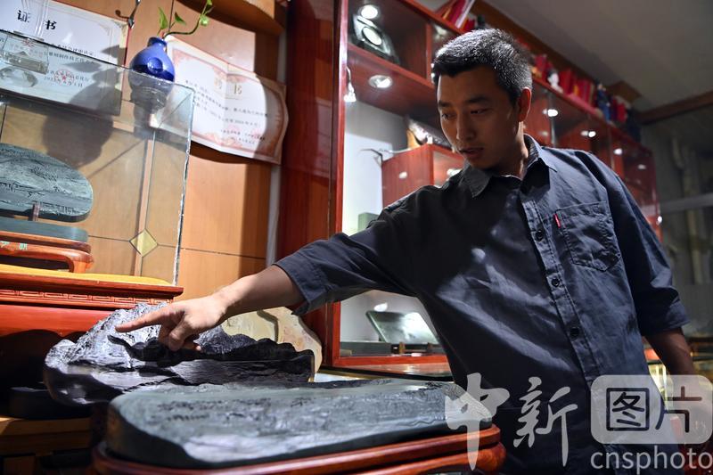 7月13日,在甘肃省兰州市一洮砚技艺传习所内,38岁的李江平展示雕刻的洮砚作品。