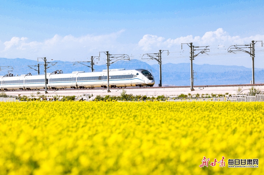 盛夏时节,祁连山下的山丹马场、民乐县境内的油菜花竞相开放,高铁飞驰在一望无际的油菜花海之间,美不胜收,令人心旷神怡。