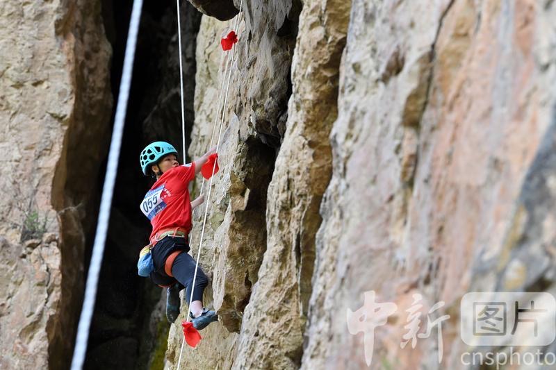 7月15日,2023中国攀岩自然岩壁系列赛(甘肃定西漳县站)在甘肃省定西市漳县遮阳山景区开赛。该项比赛场地岩壁整体高度近100米,平均坡度85度。图为女子专业组选手在比赛中。 中新社记者 九美旦增 摄