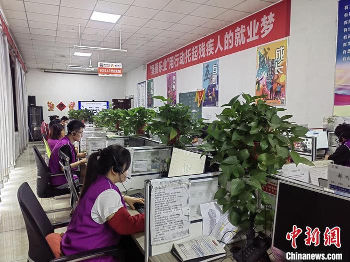 图为集善乐业残疾人网络就业(甘肃·庆阳)基地,30多名残障人士正忙着接听、回复来自全国申通客服热线。 刘新艳 摄