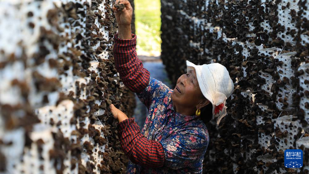 7月29日,在卓尼县纳浪镇纳浪村黑木耳种植基地,农户在翻晒黑木耳。新华社记者 张智敏 摄
