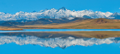 祁连山下山丹马场,雪山巍峨,碧水如镜。