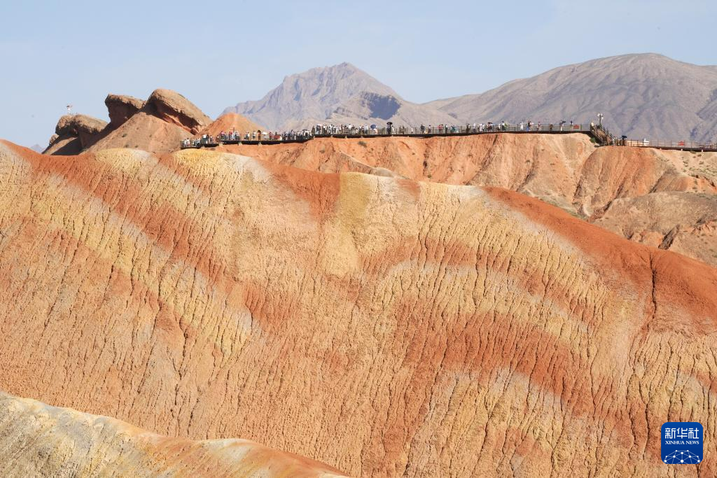 8月7日,游客在张掖七彩丹霞景区参观游览。新华社记者 马宁 摄