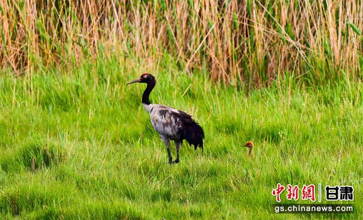 成群结队的白骨顶携幼崽戏水,无忧无虑的小鸊鷉趴在妈妈羽翼里好奇观望,毛茸茸的白鹭宝宝在巢穴中蹒跚学步,萌萌的绿头鸭跟着妈妈在水中游泳学捕食,刚出生的小黑鹳躲在妈妈羽翼下寻求庇护,悠然自得的黑颈鹤一家三口在湖边漫步休憩……一幅幅温馨育雏的画面暖化人心,幼鸟憨态可掬的模样和温馨有爱的哺育场景,成了酒泉湿地一道靓丽的生态美景。