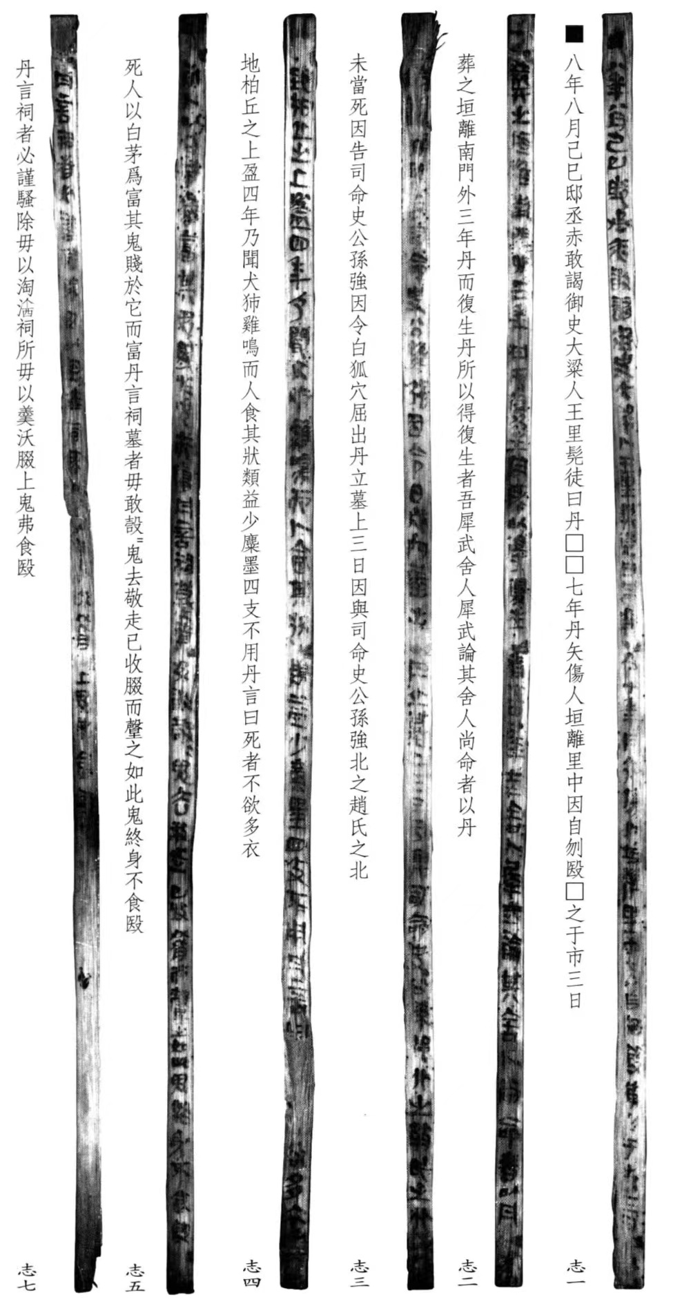 八年八月己巳,邸丞赤上报御史。有一个出生在大梁王里,名叫作丹的髡(kūn)徒,某某七年,在垣离里中用箭矢伤人,随即自杀,被(弃市)三日,埋葬在垣离南门外。三年后,他又死而复生。丹之所以能够死而复生,是因为他是我们魏国犀武的舍人。犀武和他的一个精通卜算人命的舍人认为丹罪不至死,所以请司命史公孙强让白狐将丹的尸身从墓中挖掘出来。丹在墓上站了三天,又随司命史公孙强到赵国北方的柏丘一地。满四年之后,丹才能听到狗叫鸡鸣的声音,才能够吃生人吃的饭食。那时丹的外貌是这样的:喉部有疤痕、眉毛稀少、面色发黑、四肢僵硬。丹说:死者不喜欢有很多的衣服;死人看重白茅之类的随葬品,但鬼却不以为然,他们更看重其他物品。丹说:祠墓者不能哭,否则就会把鬼惊跑;祭祀完毕了也不能把餟(chuò)食全部吃光,这样做鬼就终身不再享用餟食了。丹说:祠者必须小心地打扫祭祀场所,不要用淘洗过东西的脏水洒地;不要将羹汤浇在餟食上面,如果这样,鬼就不会享用餟食。
