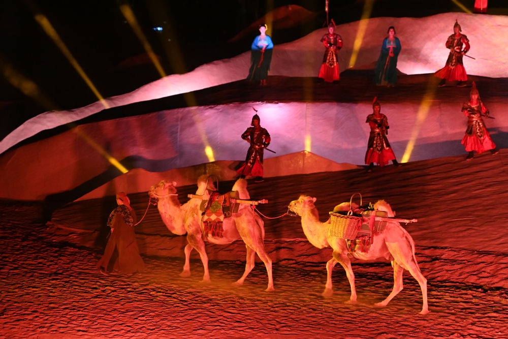 四剧“同台”打造敦煌文化视觉盛宴——《敦煌盛典》今年以来,脱胎于敦煌文化的洞窟沉浸式体验剧《乐动敦煌》、室内情景体验剧《又见敦煌》、沙漠实景演出《敦煌盛典》和中国残疾人艺术团情景音画剧《千手千眼》四场剧目在丝路名城甘肃敦煌同步上演,剧目将敦煌历史底蕴、服饰文化、乐舞文化等生动融合,为游客呈现出精彩绝伦的敦煌文化视觉盛宴,深受中外游客喜爱。截至8月10日,四大剧目今年已累计演出1175场次,观看游客突破66万人次。其中,《敦煌盛典》以敦煌鸣沙山月牙泉为背景,将沙漠景观与现代舞美结合,将墙体灯光融入实景演出,讲述了一段发生在古丝绸之路重镇敦煌的爱情故事,展示了敦煌的历史文化及人文风貌。