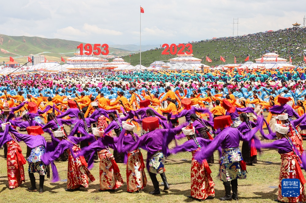 8月10日上午,甘肃省甘南藏族自治州合作市当周草原上,一场盛大的草原歌舞盛宴开始上演。甘南州成立70周年庆祝大会正在举行中。