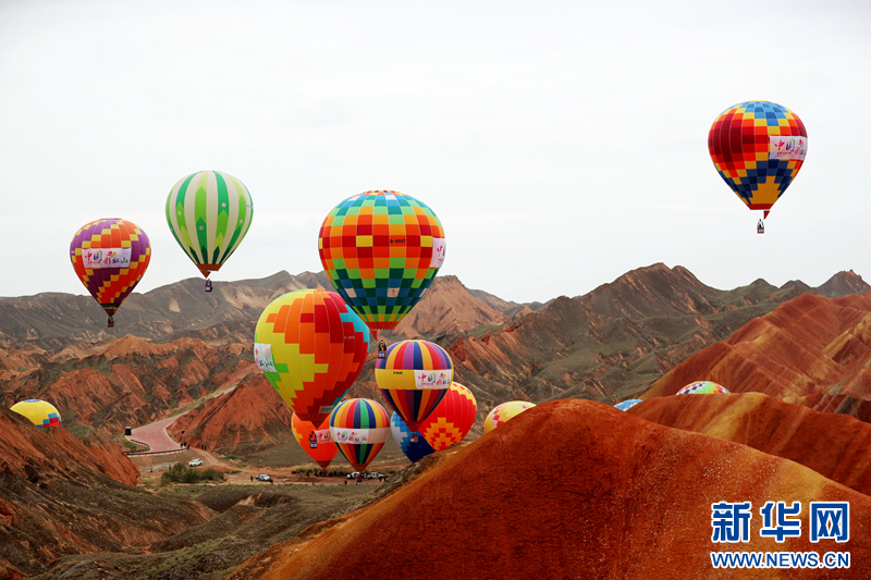 8月16日,为期三天的第三届张掖七彩丹霞热气球嘉年华在甘肃省张掖市开幕。来自全国各地的40名热气球运动员驾乘40具热气球,在张掖七彩丹霞上空进行集中飞行表演,一览彩色丘陵与丹霞地貌和谐交融的壮丽美景。新华网发(成林 摄)