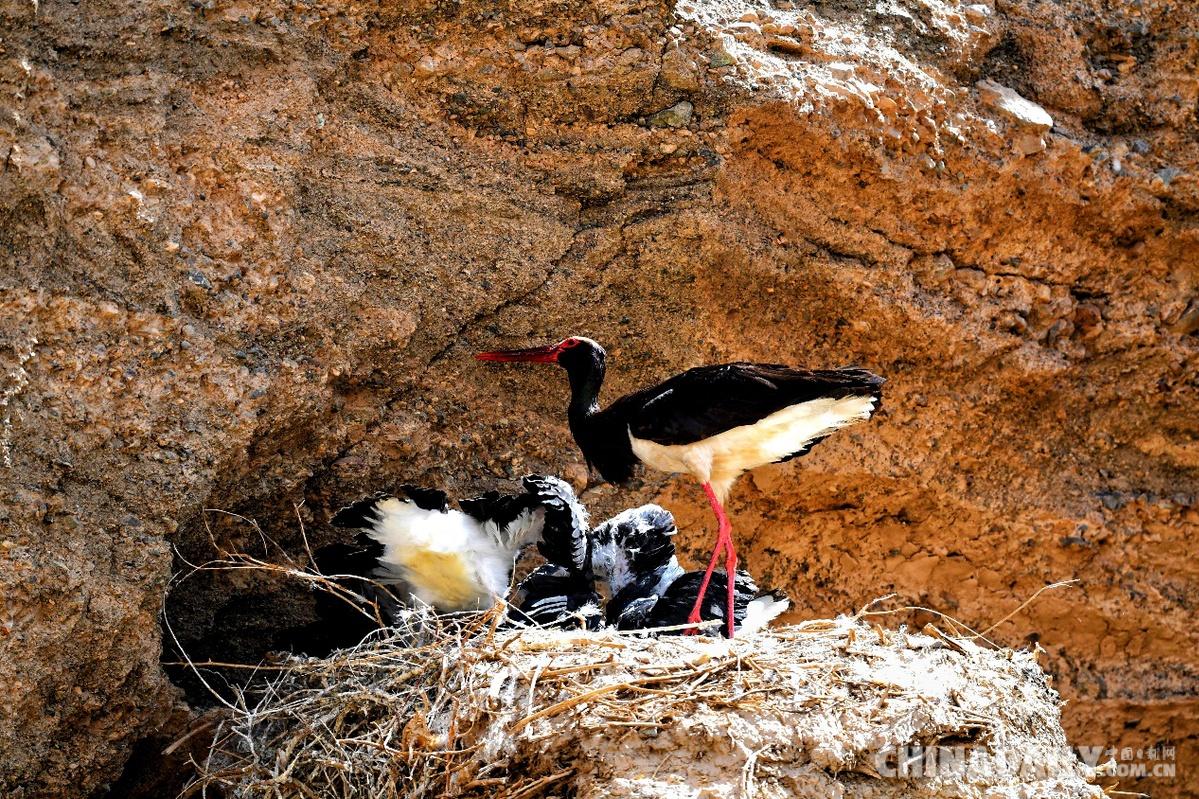 据保护站巡护人员介绍,黑鹳在祁连山境内属于夏候鸟,主要繁殖于河流两岸、高山山顶裸岩的岩壁平台上,每年4月下旬开始筑巢,7月中旬就可看到成鸟领着幼鸟觅食。此次监测到黑鹳巢居并孵育雏鸟,是首次记录到黑鹳繁殖。