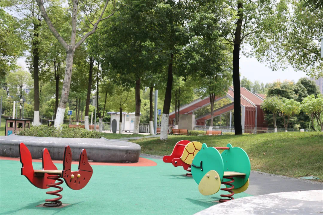 2022年,对该公园进行了提升改造,对轴线水景、游客休息设施、运动场地等进行了翻新维护。对轴线水景重新做了防水、做面层。对损坏严重的木平台的木板和龙骨等更新,坐凳则是保留现有钢结构,做刷漆翻新出来,更换座面木板。对塑胶地面则是剔除现状塑胶地面面层并在冲洗干净、干燥后做防水处理,再铺设PEDM和硅PU面层。