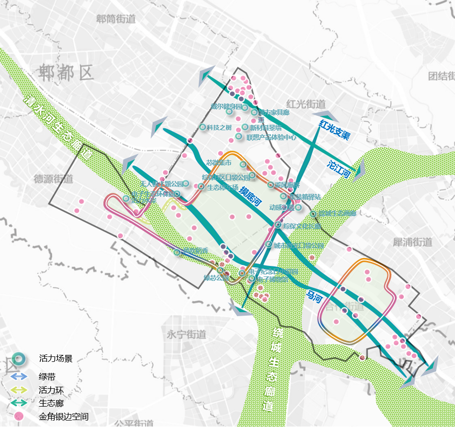“依托清水河与环城生态带生态资源禀赋,成都高新西区构建‘两廊、四带、两环’公共空间体系,着眼城市‘生态’优化提升公共空间,以‘无一米不规划’的建设管理要求,促进片区空间结构调整。”成都高新西区发展建设指挥部相关负责人介绍,高新西区“金角银边”公共空间规划街旁、桥下、屋顶、滨河、基础设施周边五类公共空间,联动区域产业特色,织补式激活城市边角空间,打造91处城市“金角银边”,提升完善西区公共空间功能。同时,针对檬柏、顺江等重点社区,营造“开放共享、烟火共美、科技共创、城民互动”四类公共空间主题风貌,提高宜业宜居环境品质,打造成都高新西区智造新形象。