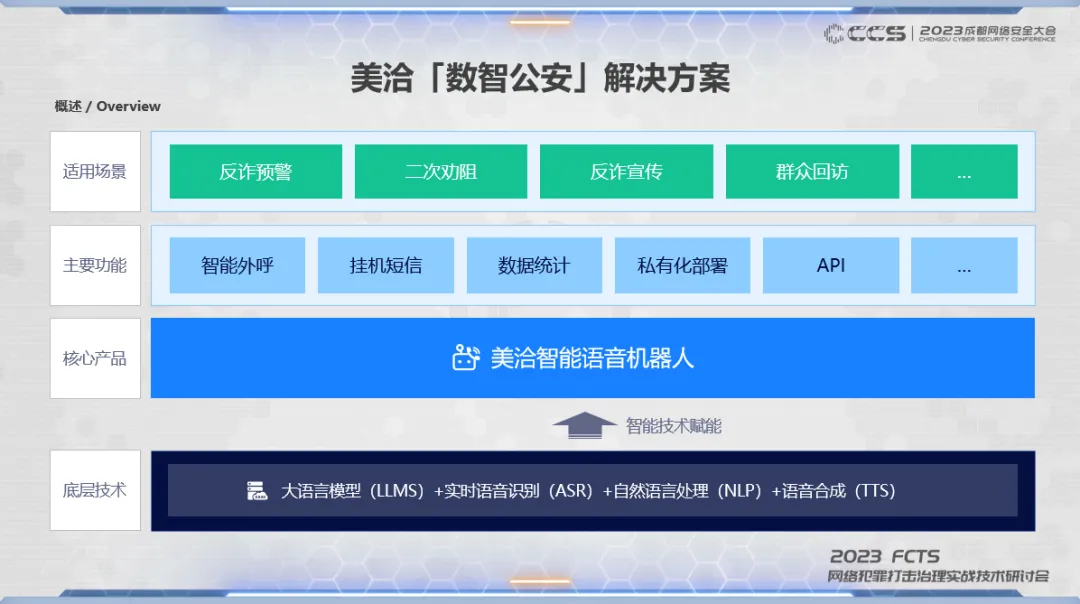 该方案以AI大语言模型、实时语音识别、自然语言处理、语音合成等一系列智能技术为基础,并将其赋能给美洽智能语音机器人,使机器人在已有的智能外呼、挂机短信、数据统计等功能之上,适配诸如反诈预警、二次劝阻、反诈宣传等场景,助力公安部门达成反诈骗的目标。