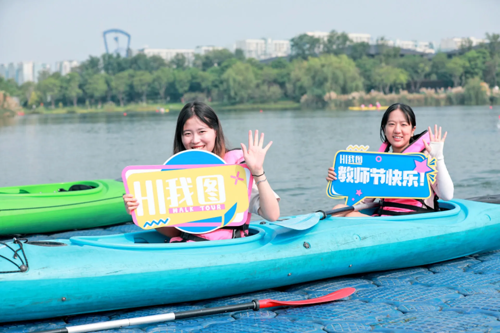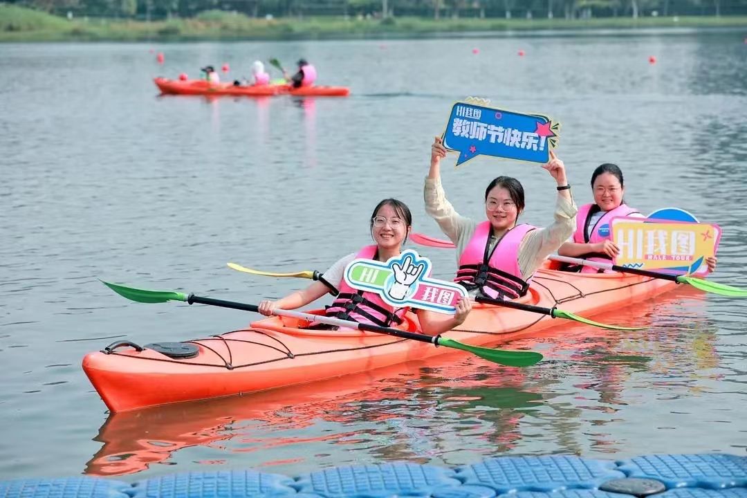 9月9日当天,活动的首站,老师们来到锦城湖。这里湖区总水面66.9万平方米,湖面清澈如镜,十分适合水上运动的开展。主办方特别邀请专业皮划艇老师现场教学,带领老师们在秋日微风中体验水上运动的乐趣。