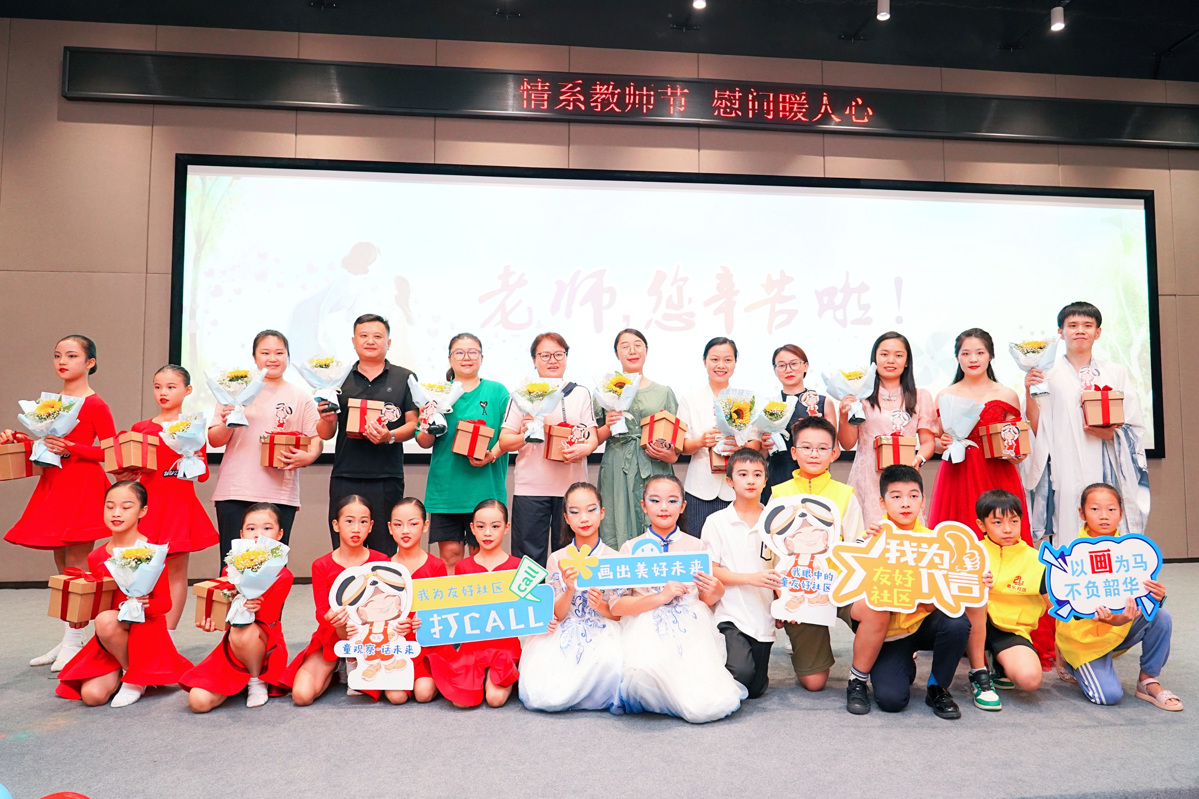 活动当日正值教师节前夕,社区儿童观察团团员和儿童志愿者还为辖区学校、幼儿园的老师代表送上了节日的鲜花和祝福。在绘画比赛颁奖环节,嘉宾代表为一、二、三等奖和优秀奖的获奖小画家颁发了奖状、社区儿童友好形象“乐乐”奖牌和绘本、绘画套装、文具礼盒等奖品。