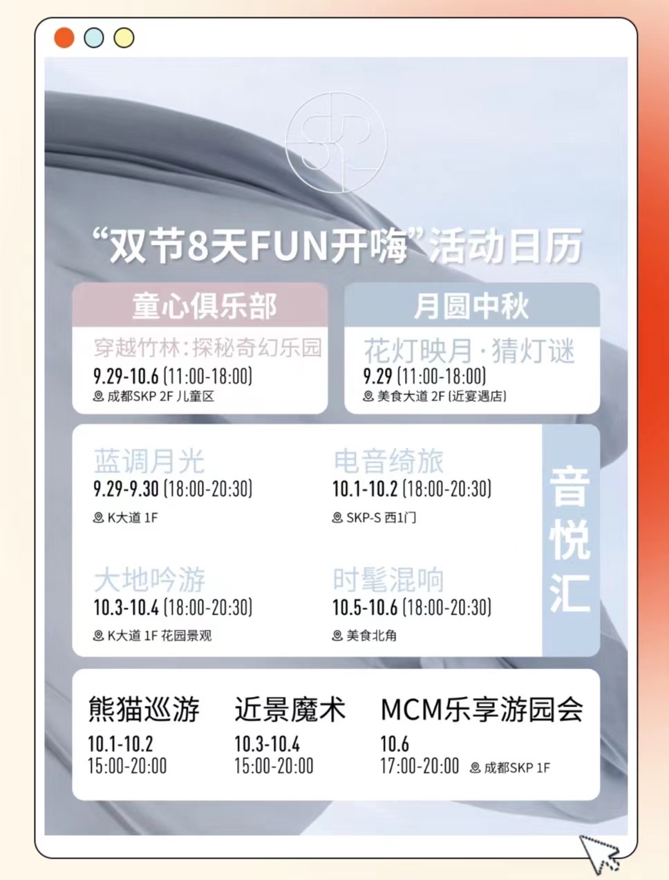 为欢度“双节”,成都SKP在8天假期内,每天都将举办精彩纷呈的活动,包括童心俱乐部、猜灯谜、电音party、近景魔术、游园会……同时,购物还有化妆品10倍积分、满额赠礼、银行刷卡礼、新会员开卡礼等优惠活动。