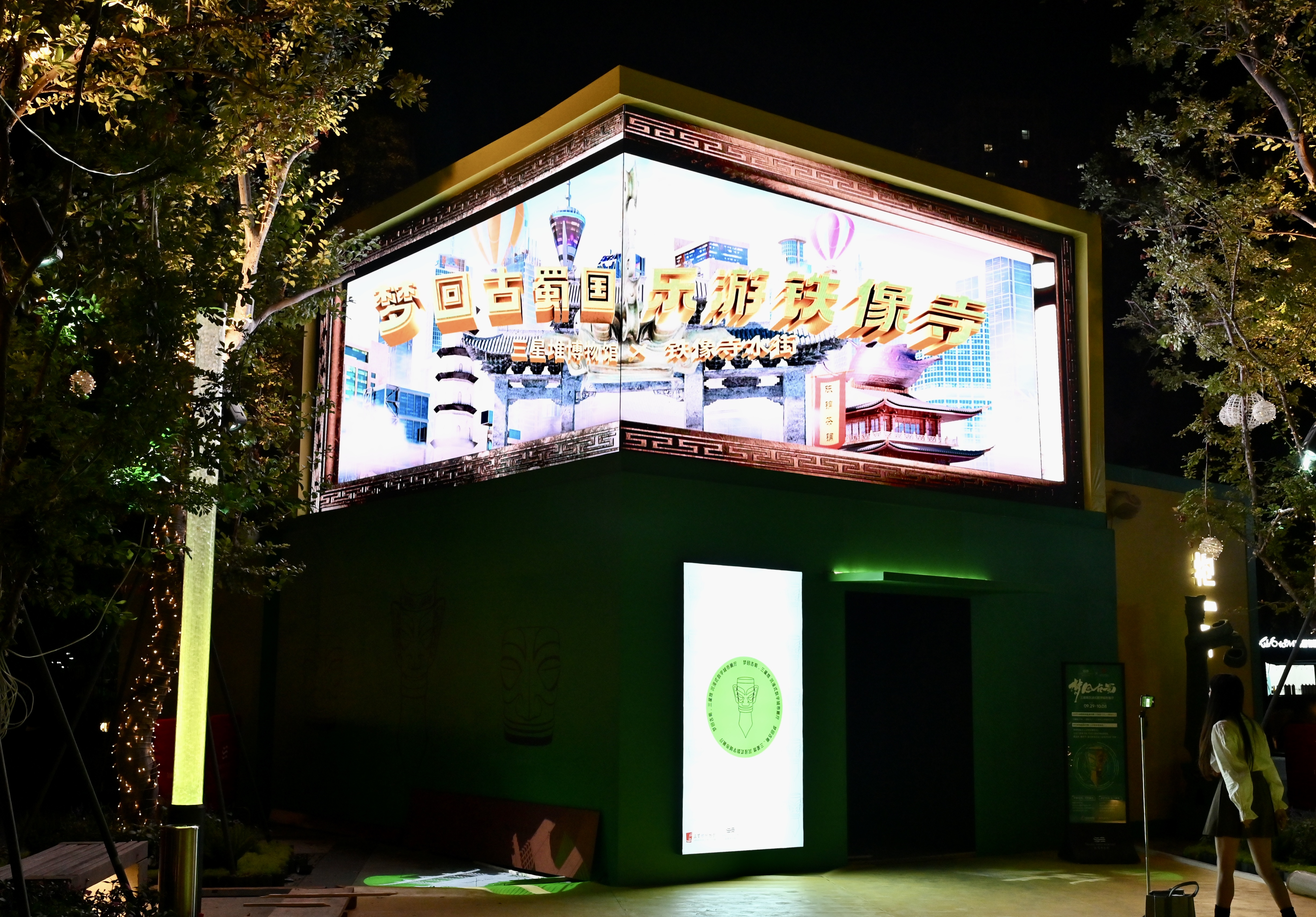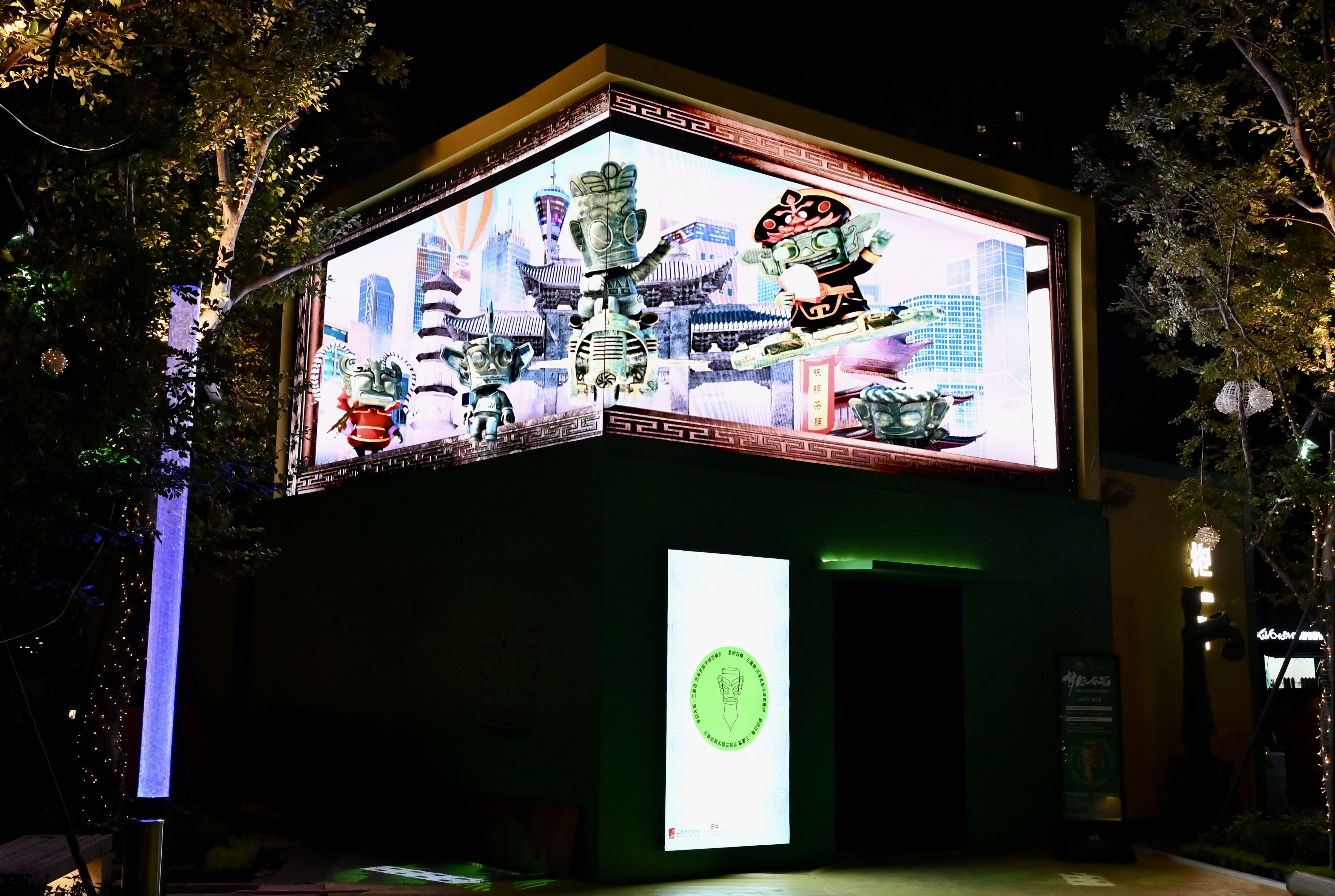 展厅分为户外与室内两个区域,占地面积总计约300平方米,户外区域设置裸眼3D大屏,室内则是三星堆文创展示和京东方研制的8K 110寸3D概念屏。