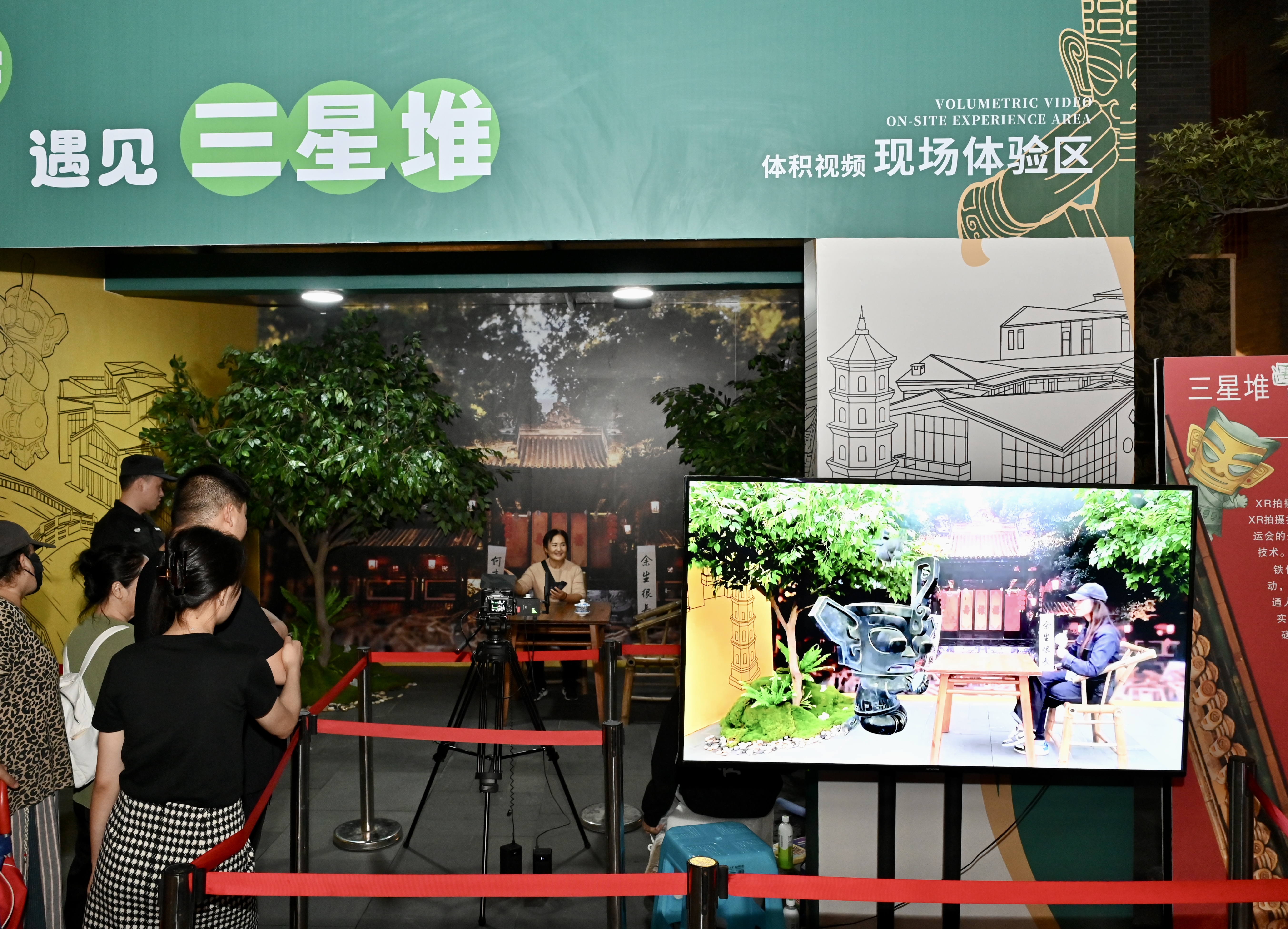 而室内区域则是虚实结合的场景体验。在京东方研制的8K 110寸3D概念屏里,播放着从古蜀国穿越现代铁像寺的三星堆主题视频,采用央视频“12K沉浸式数字展示技术”则让观众以微缩角度观文物。