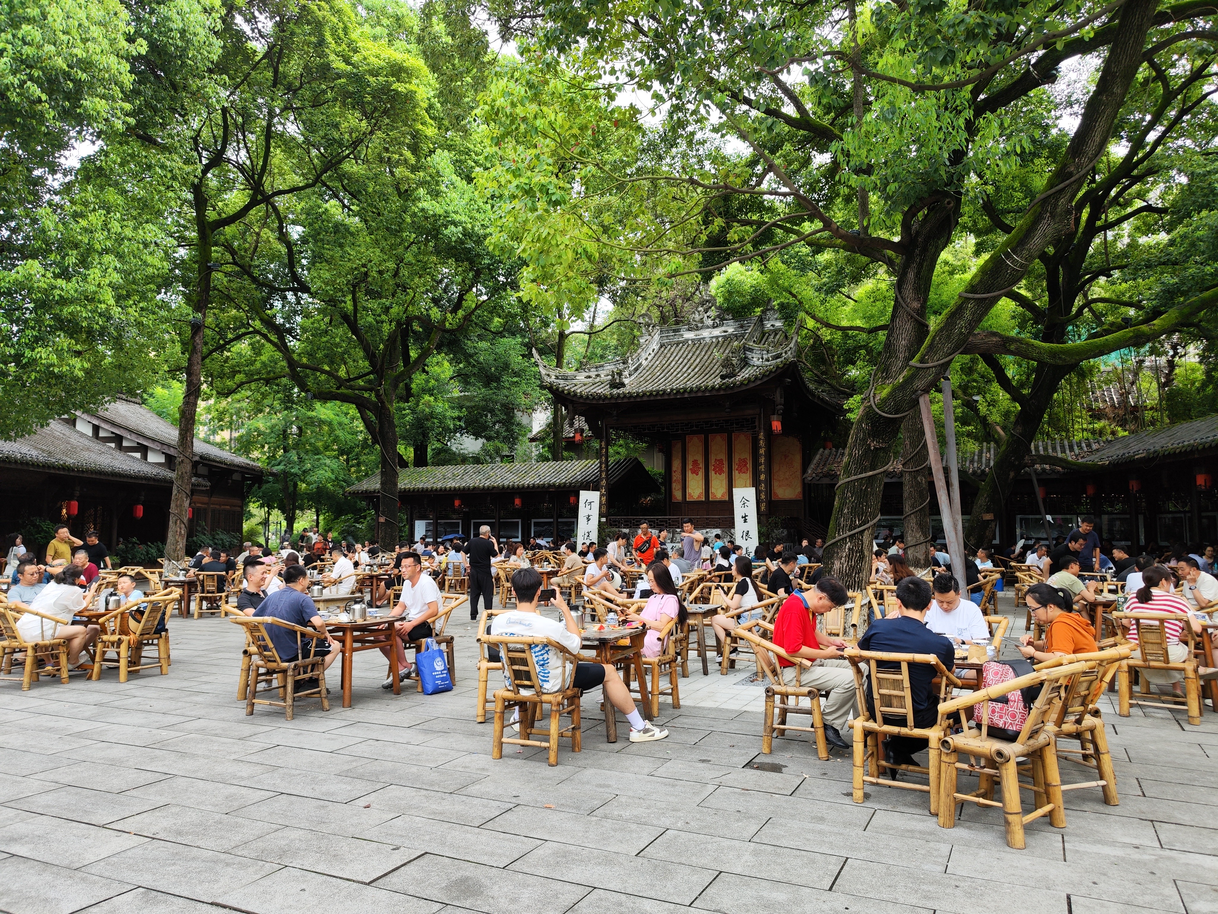 再往前走上十几米,人逐渐多了起来,大家喝着茶、打着牌、唠着嗑,好生热闹。在这里,步伐都在不知不觉中变慢了,似乎流水声、嬉笑声拉慢了秒针转动的节奏,时间仿佛在这一刻停止。这种市井生活的烟火气,是难得的自然生活画卷,成都人的安逸悠闲,在大街小巷的茶馆里,体现得淋漓尽致。