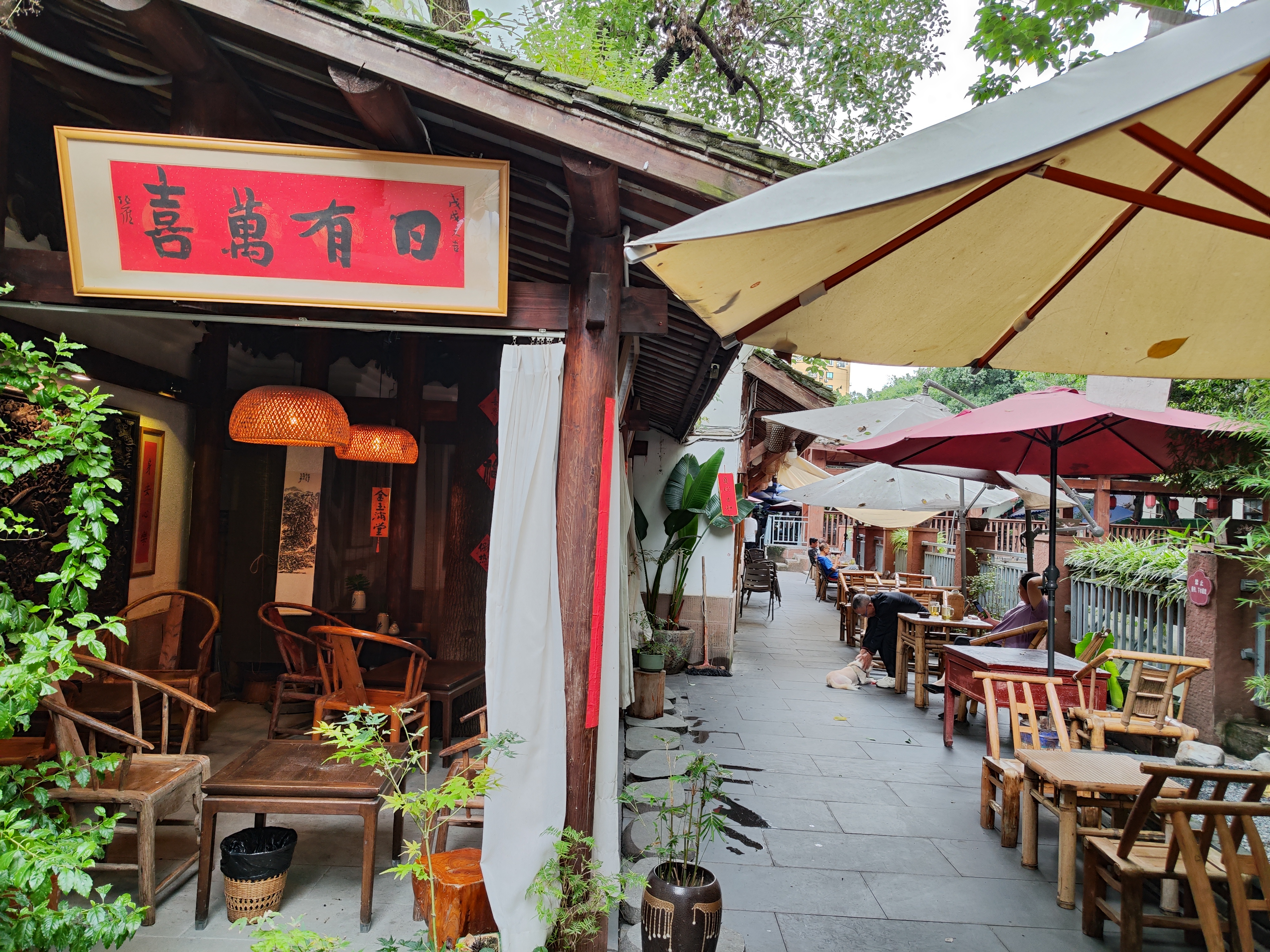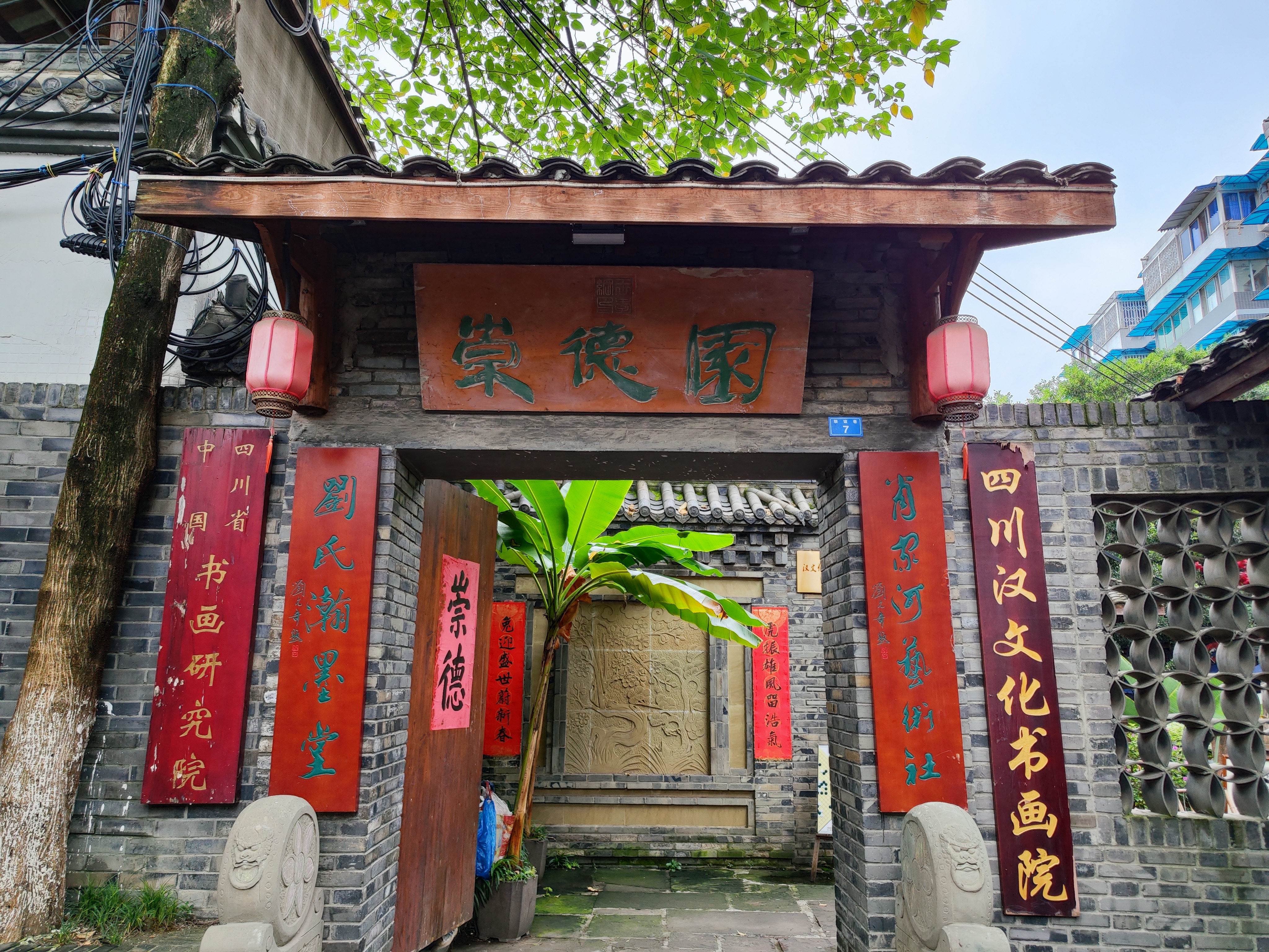站立在崇德园的西北门,“四川汉文化书画院”“四川省书画研究院”“肖家河艺术社”等牌匾惹人注目,如果不是有人指引,很难想象崇德园中还可以喝茶。踏入园内,小矮桌、竹靠椅尽收眼底,桌椅旁还挂有字画,边喝茶、边欣赏字画,也是一种别样的体验和乐趣。虽然道路不宽,但桌椅不少,沿着肖家河密密匝匝地看不到尽头。