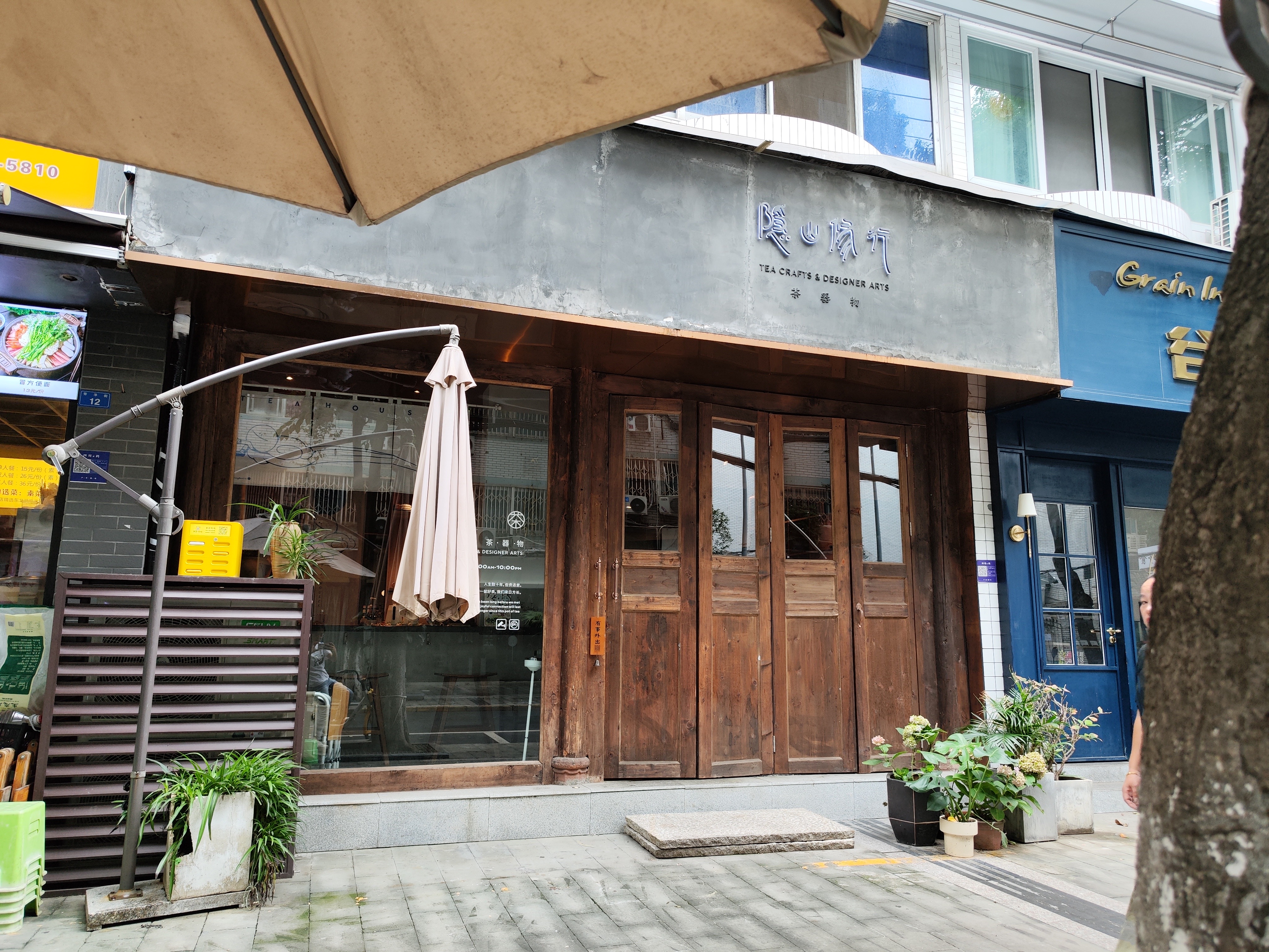 另一家位于芳草东街的隐山修行茶馆也很别样,与试喝小报截然不同的是,深灰色的的门头,木质深棕的门框,在一排排铺面中显得格外别致。店内的每一个器物都很讲究,古朴的格调显得颇有质感。在空间的设计上,划分了三个区域,分别是吧台、客厅和雅室,满足观看泡茶过程、和朋友闲聊、个人独自看书的各种需求。屋内还有一面书墙,五排书架上错落有致地摆放着各类的书籍,挑选一本符合胃口的书,在一杯杯茶水的陪伴下,在茶馆里偷得浮生半日闲,体验成都独有的悠闲时刻。