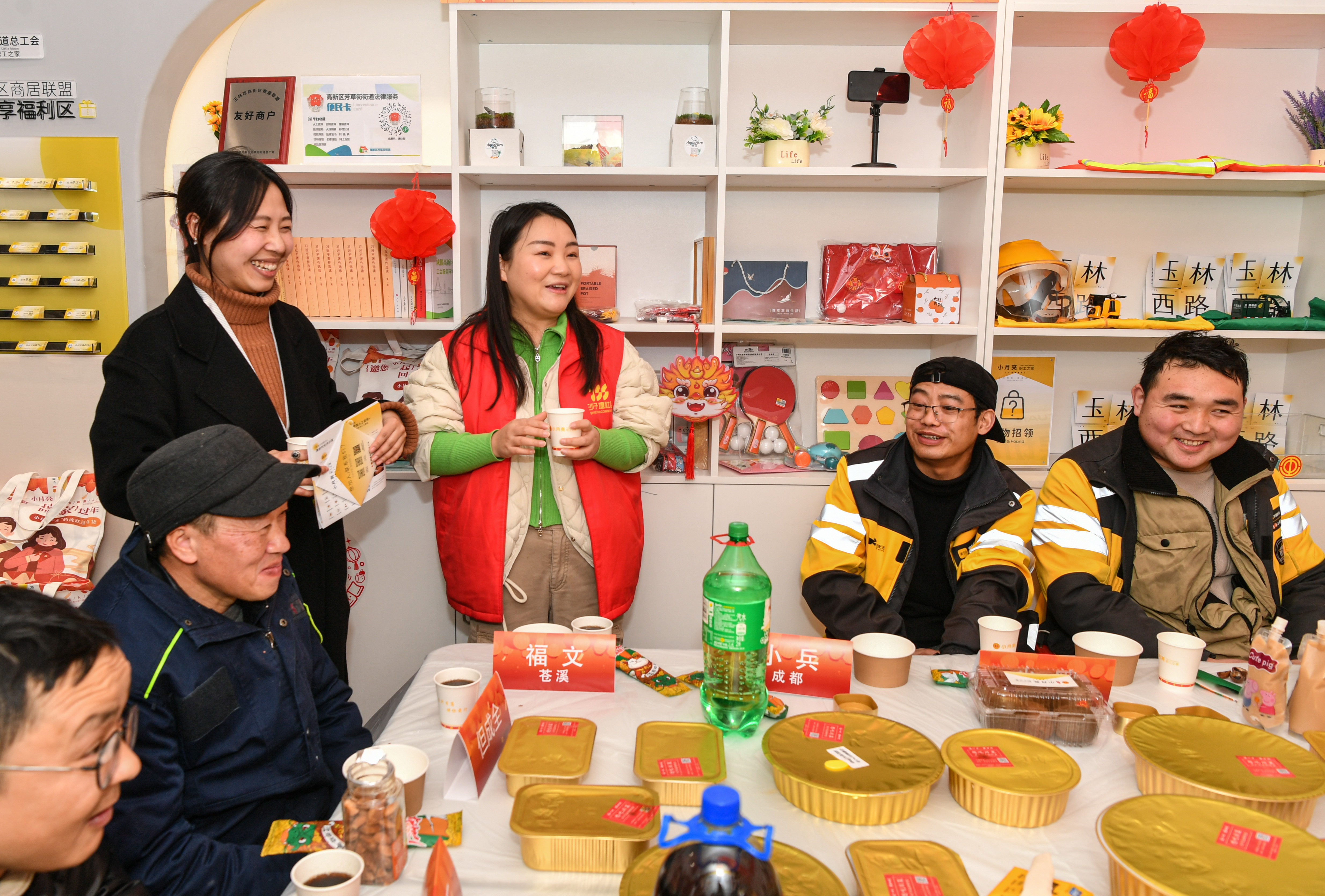 夜幕降临,成都高新区芳草街街道的“小月亮职工之家”灯火璀璨,一阵阵欢声笑语传到街上,路过的行人都能感受到里面热闹开心的氛围。芳草街街道总工会邀请辖区外卖骑手、环卫工人等新就业形态劳动者齐聚在这里共享一顿美味的年夜饭。年夜饭的形式是多样化的:下班较早的环卫工人,可以来领取一份年夜饭,回家和家人共享;上晚班的环卫工人和外卖小哥,则相聚“小月亮之家”,一起吃顿年夜饭。