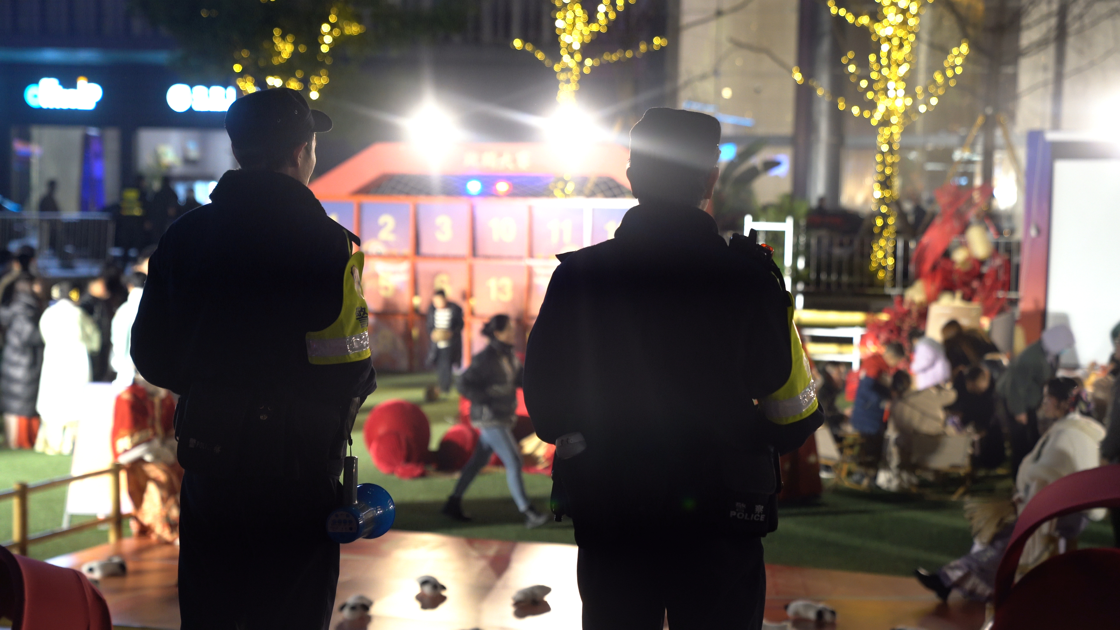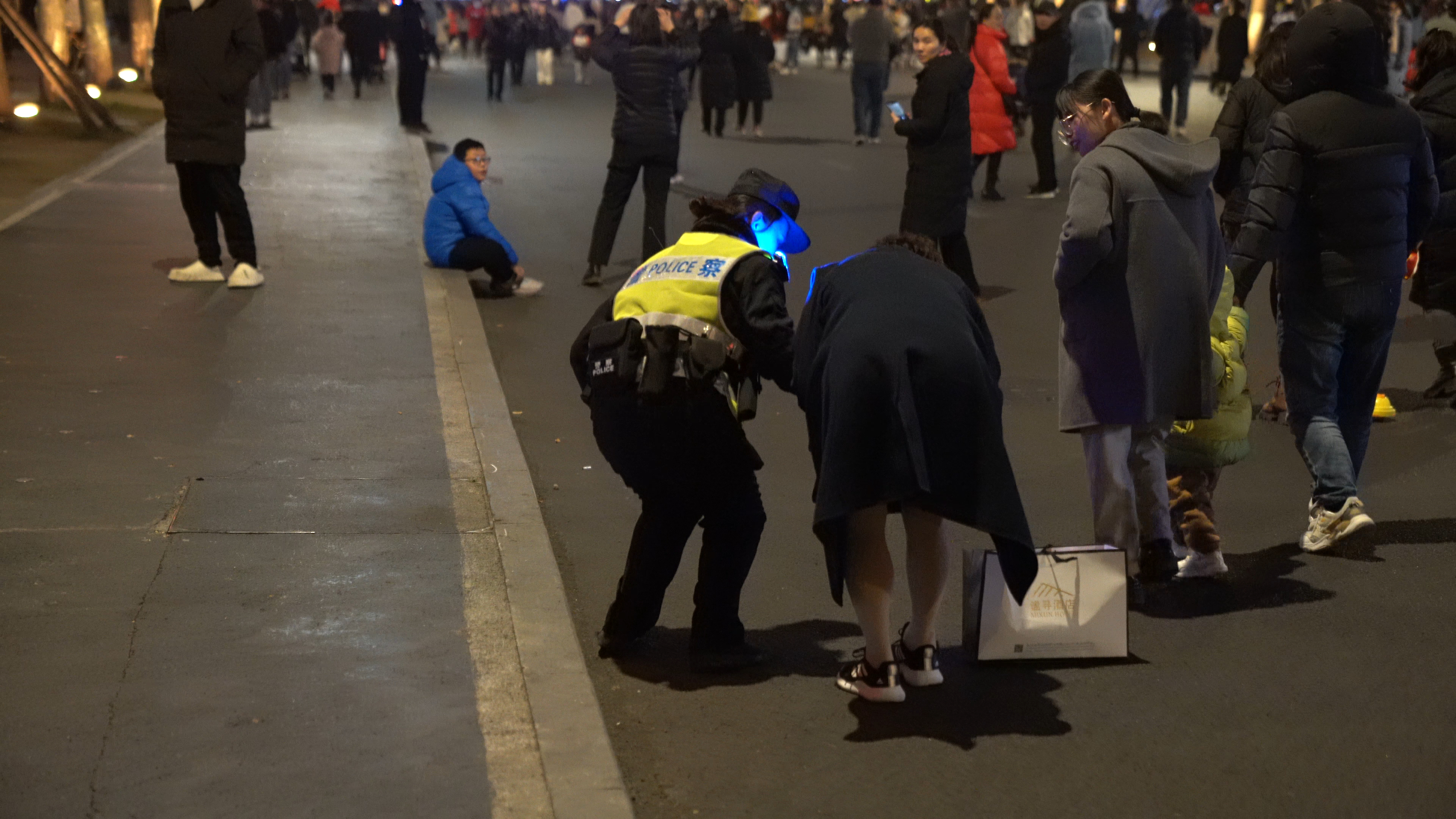 “警官,我的孩子好像走丢了?”“刚刚这里有一个小孩在哭,我们带到一边去了,看看是不是你家孩子。”“我外地来旅游的,想吃点地道的川菜,请问附近哪里有餐馆。”“沿着这条路往前走就是一个商场,里面有很多吃的……”第一次参加元宵节的执勤任务的民警耿浩亚正在现场处理市民求助,“大多是老人小孩走失,或者询问厕所、餐厅的位置等问题。”