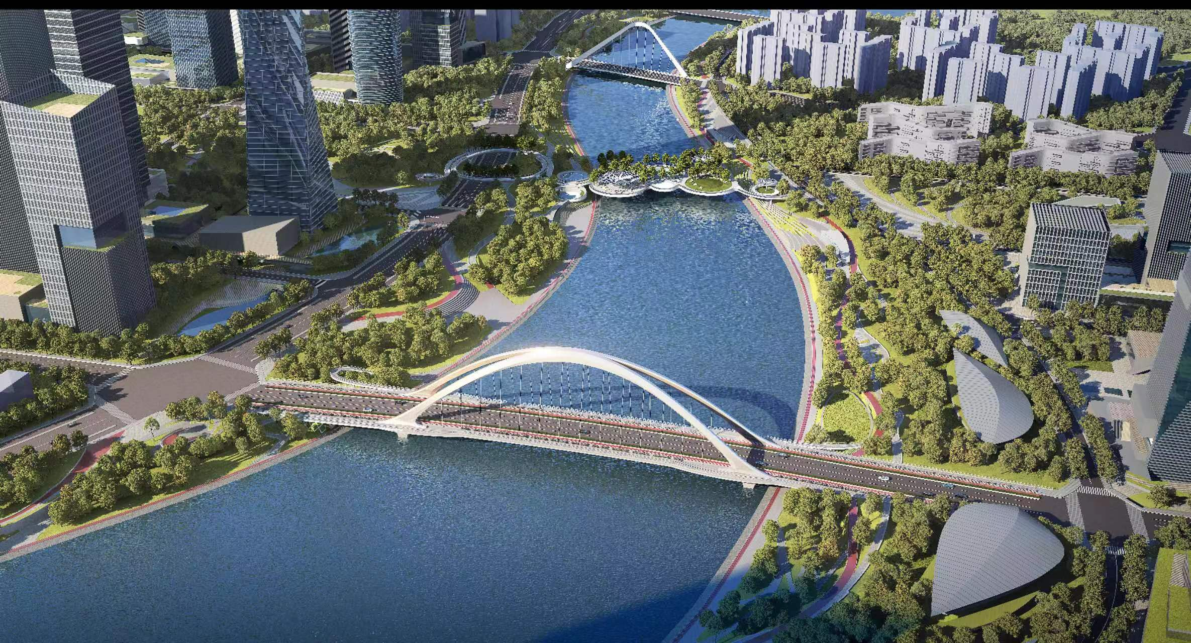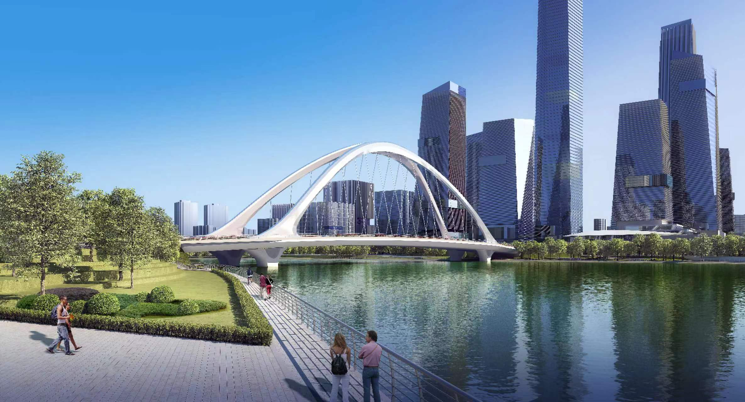 交子公园金融商务区正在形成7座车行桥跨江格局,包括府城大桥、锦言大桥、交子人行桥、锦尚大桥、心岛桥、泰祥桥和绕城桥。其中,成都交子人行桥目前正在建设中,该桥由多个大小不一的圆形拼接而成,其外形酷似9片漂浮在水上的“莲叶”,建成后将在连通成都交子公园东、西两岸,便捷市民出行的同时,带来美景如诗、步步生莲、盛世繁华的美妙“过桥”体验。