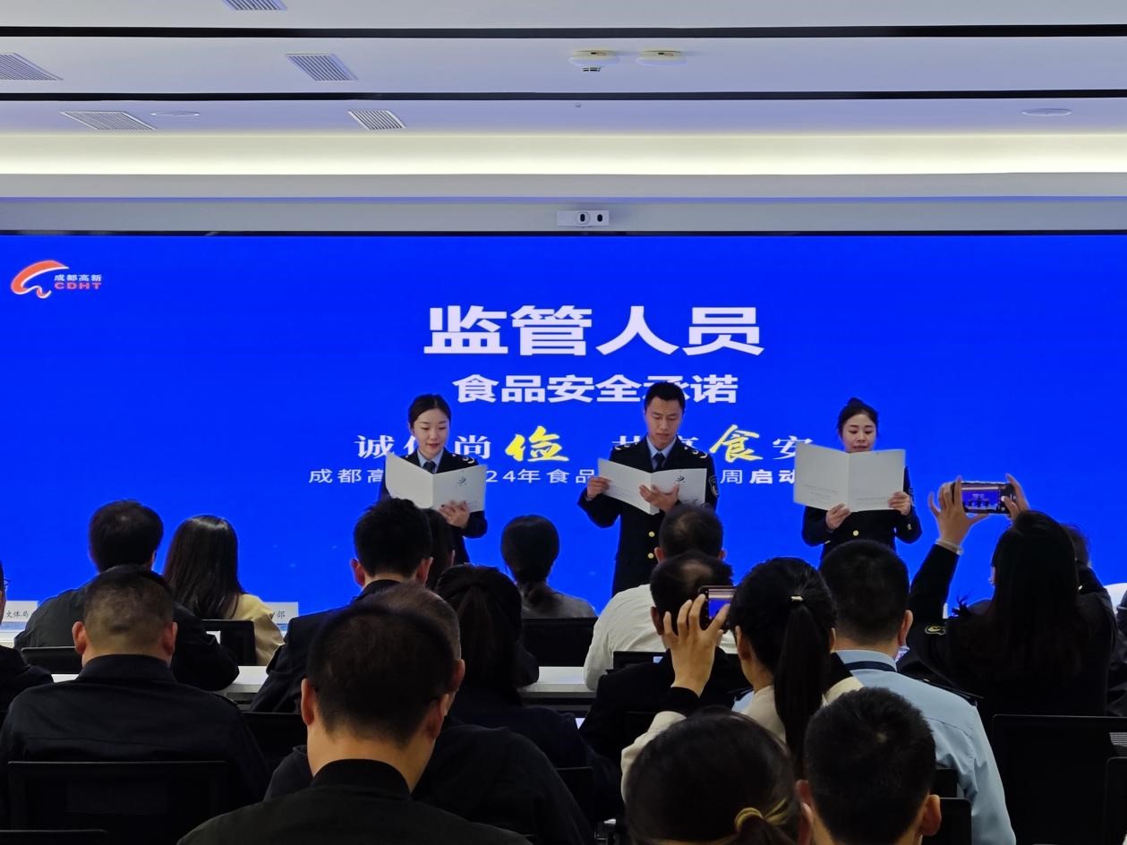 成都高新区市场监管所的监管执法人员代表现场作出承诺,表示将坚持党建引领市场监管高质量发展,树立“讲政治、守规矩、业务精、作风好”的市场监管队伍形象,牢牢守护群众“舌尖”安全。