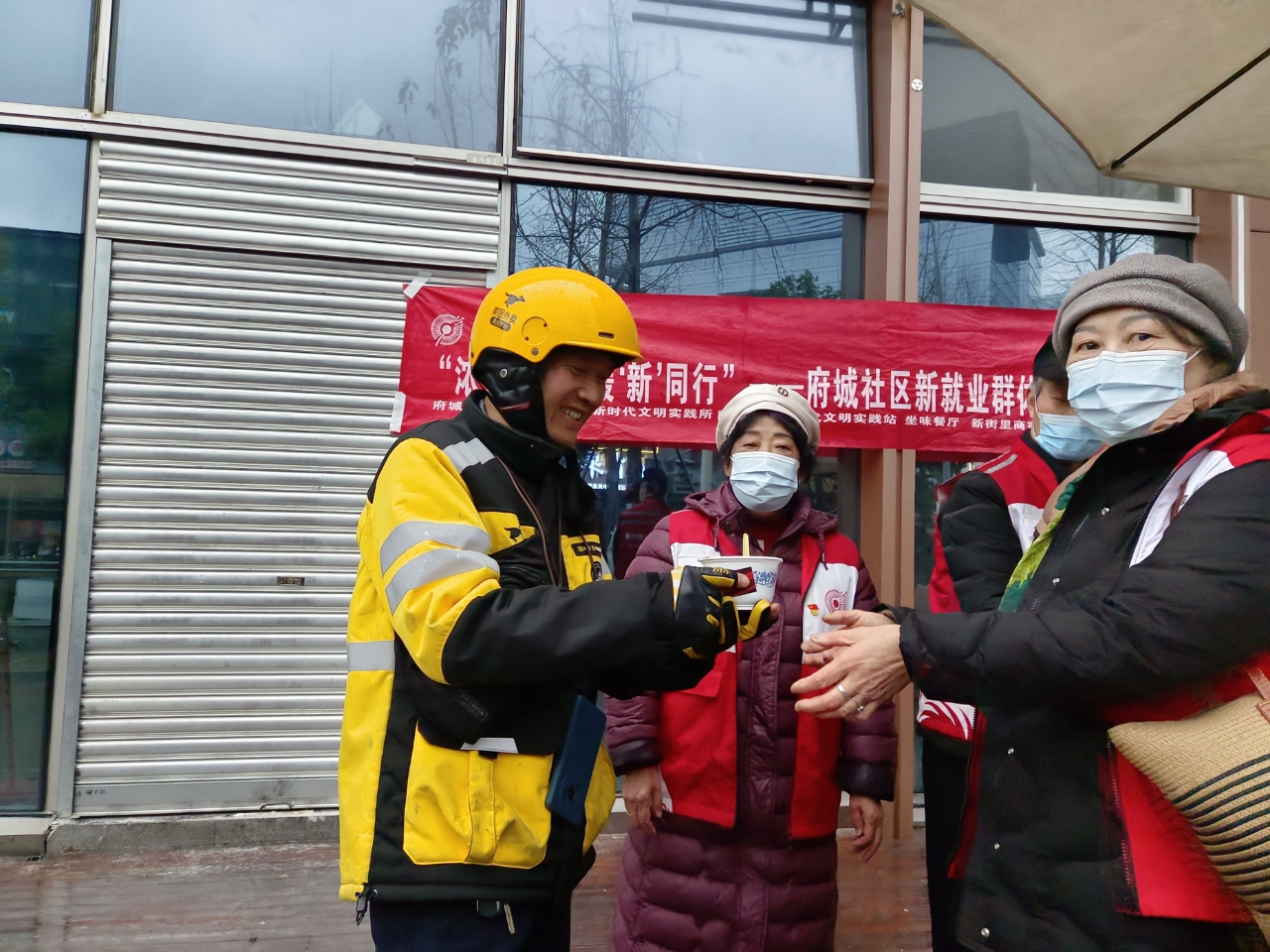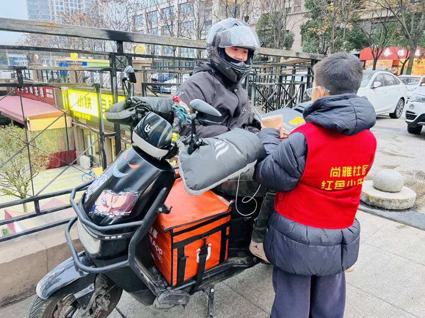 而对于那些平日里风里来雨里去的外卖员、快递员等新就业群体,小志愿者们同样热情满满。当外卖小哥在忙碌的送餐途中路过广场,小志愿者们赶忙送上腊八粥,说道:“叔叔阿姨,你们辛苦了,喝口粥再走吧。”外卖小哥接过粥,眼中满是惊喜与感动,“跑单跑得又冷又饿,这粥来得太及时了,一下子暖到了心里。”