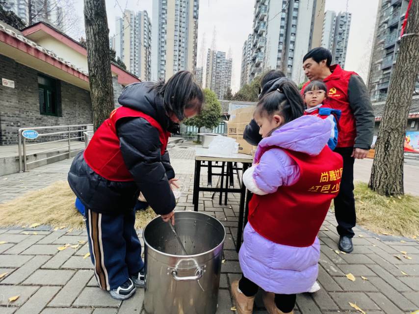 同时,石羊街道府城社区也提前收集“百家米”。来自府城社区的小小志愿者们挨家挨户地敲开了居民的家门,礼貌问询:“阿姨,我们在为腊八节给辛苦的户外工作者送粥募集食材,能请您贡献一杯米吗?”得知小朋友来意的居民毫不犹豫地从米缸中舀出一勺米,递到小志愿者手中的容器里。来自居民的百家米配上爱心餐饮单位捐赠的桂圆、红枣等食材,腊八粥的材料集齐了。