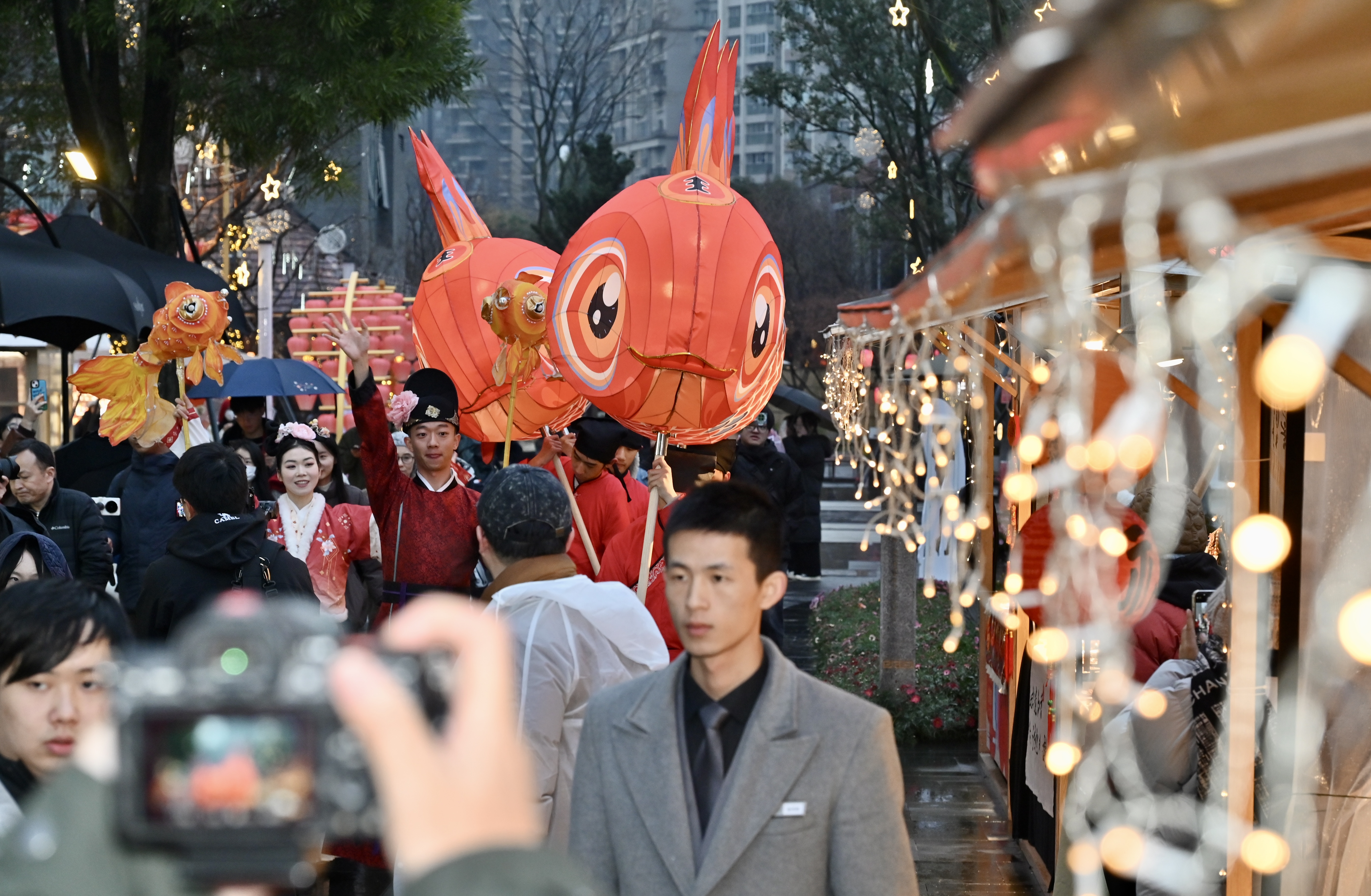 18时,一条3米多长的巨型非遗鱼灯在水街开始梦幻巡游。色彩华美、造型夺目的非遗鱼灯瞬间便让人想到“风箫声动,玉壶光转,一夜鱼龙舞”,顿时梦回那场在世人心里亮了一千多年的灯会。