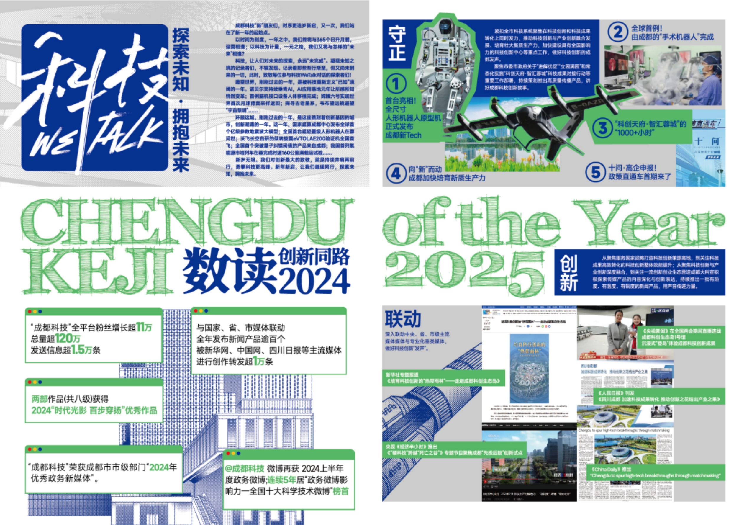 作为全国首个城市级科技垂类融媒体中心,成都科技融媒体中心(以下简称“中心”)自2019年成立以来,一直深入成都科技创新一线,挖掘、记录成都科技创新故事,并与媒体机构创新同行,共同发出成都科创宣传“最强音”。2024年,中心作为成都科技宣传 “中央厨房”,紧密围绕全市科技系统工作重点发声。“成都科技” 全矩阵平台粉丝量突破120万,发布信息1.5万条。与各级媒体联动发布超100个新闻产品,被新华网、人民网等主流媒体转发超1万次 ,还荣获成都市市级部门“2024年优秀政务新媒体”称号。在新的一年,中心也将继续向新而行,携手各方力量一起见证成都科技创新的新突破、新发展,让科技新闻更近一分、再深一度。