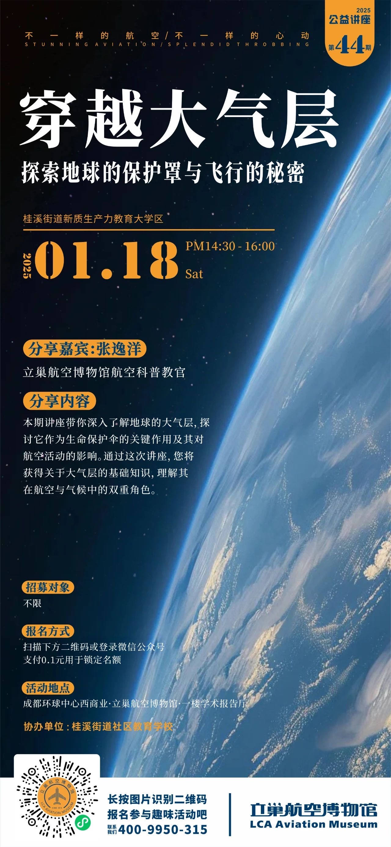 本期讲座将有专业老师讲解关于大气层的基础知识,带领大家深入了解地球的大气层,探讨它作为生命保护伞的关键作用及其对航空活动的影响。
