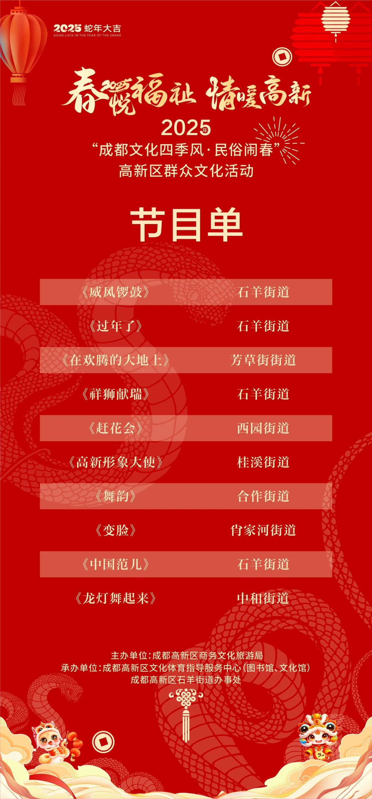 在新春佳节即将到来之际,以 “春悦福祉,情暖高新”为主题的2025“成都文化四季风·民俗闹春”成都高新区群众文化活动将在铁像寺水街举行。现场除了木偶、空竹、舞龙舞狮等优秀民俗节目展演,还设置了新春剪纸、年画拓印、画纸鸢、做新年花灯等多个体验活动,增添了热闹、纯正的传统年味。