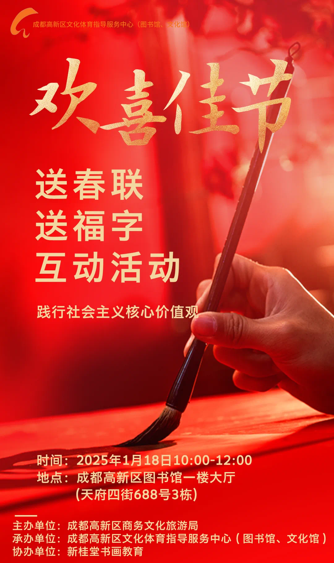 春节是中华文化优秀传统的重要载体,蕴含着中华民族文化的智慧和结晶,凝聚着华夏人民的生命追求和情感寄托。贴春联和福字一直是中国春节的传统习俗之一,抒发着人们对新年的美好愿望。春节将至,成都高新区图书馆邀请书法老师到现场为读者书写春联和福字,为新年增添一份书香气。