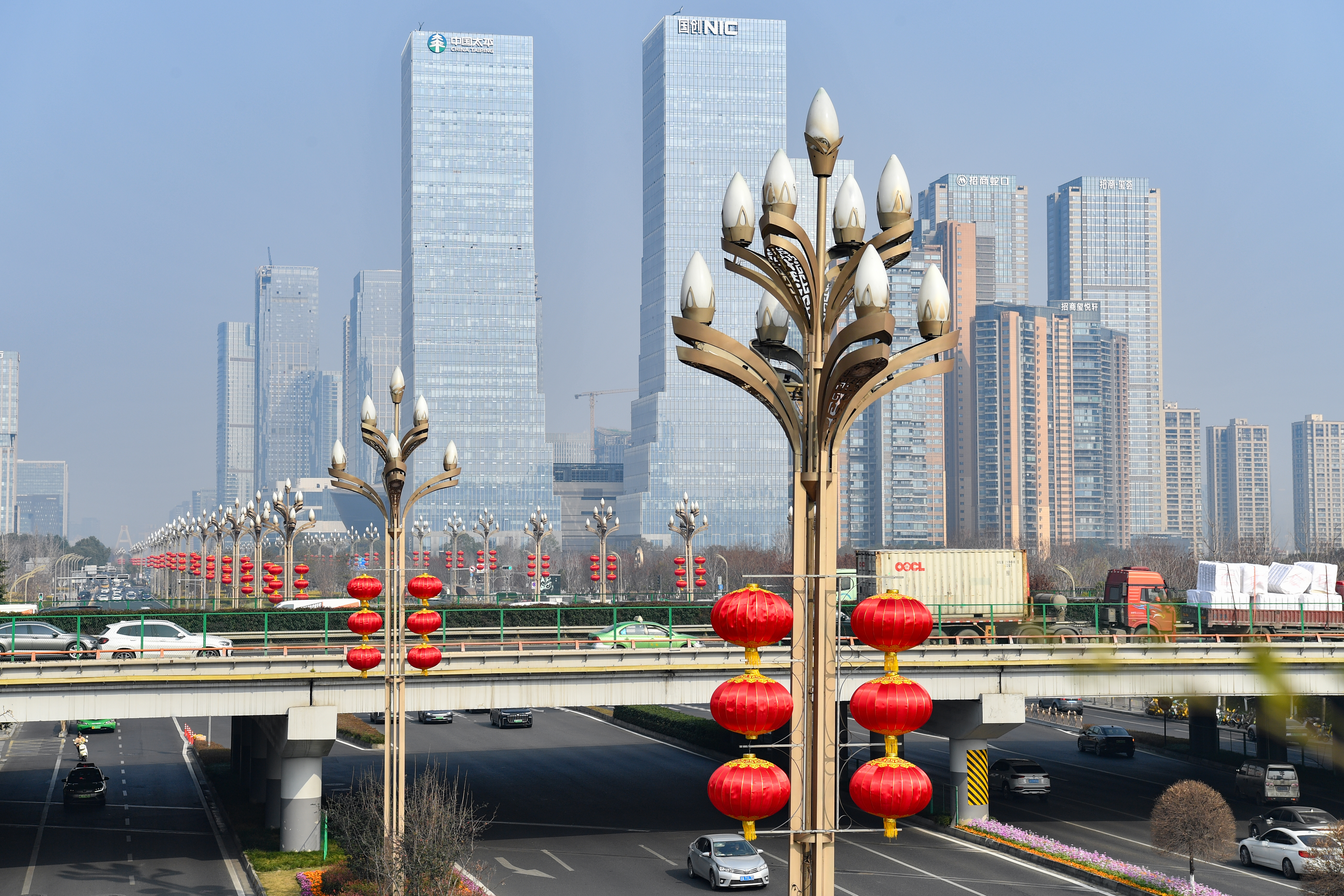 在天府·鸿锦南桥,不少市民在此拍照留念,与家人朋友分享这份节日的喜悦。桥下是车水马龙的天府大道,天府大道两侧路灯杆上悬挂的大红灯笼营造出节日的喜庆氛围,而站在桥上还可以看见环球中心、天府双塔、招商大魔方、中国—欧洲中心等城市地标。