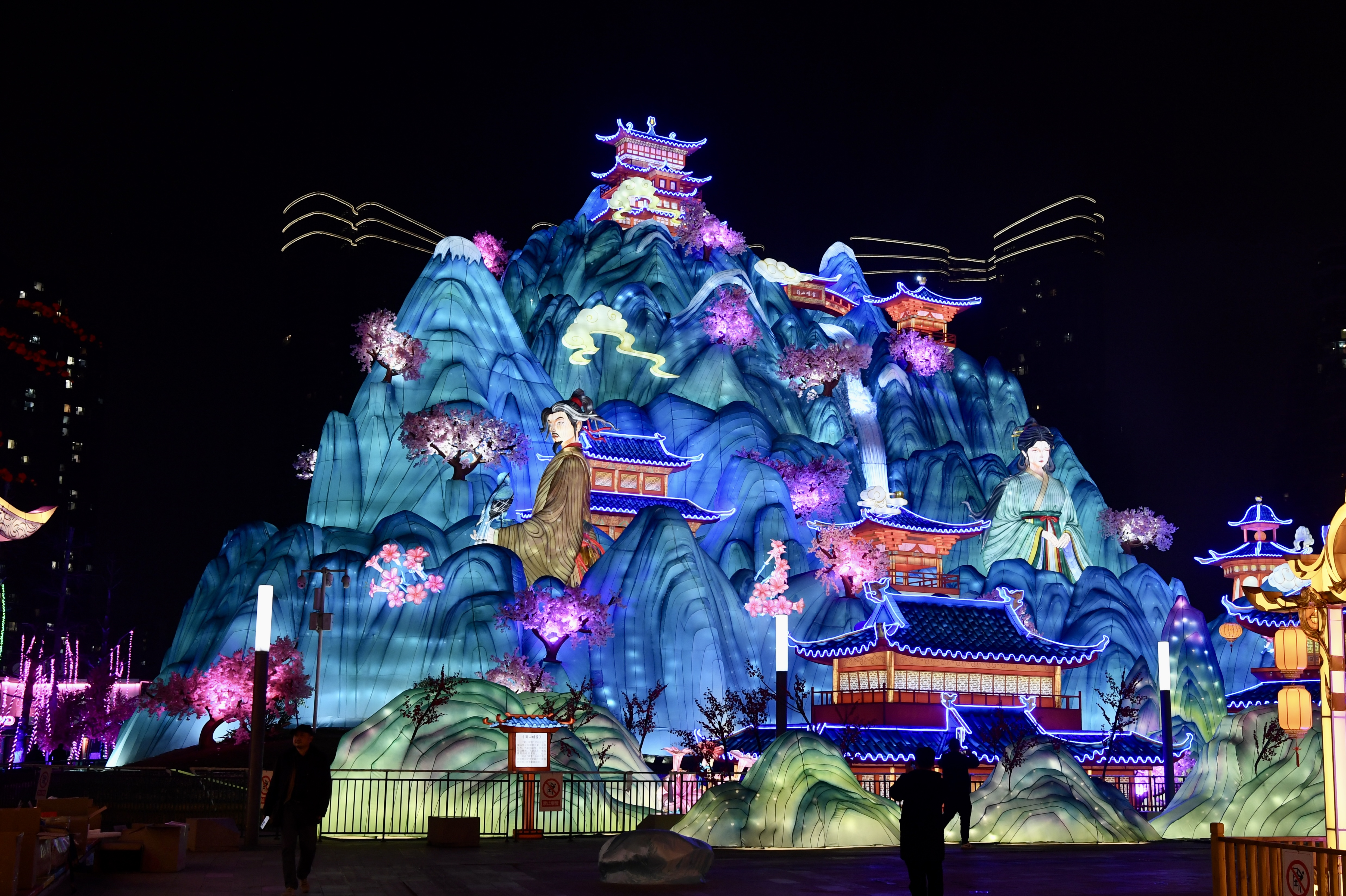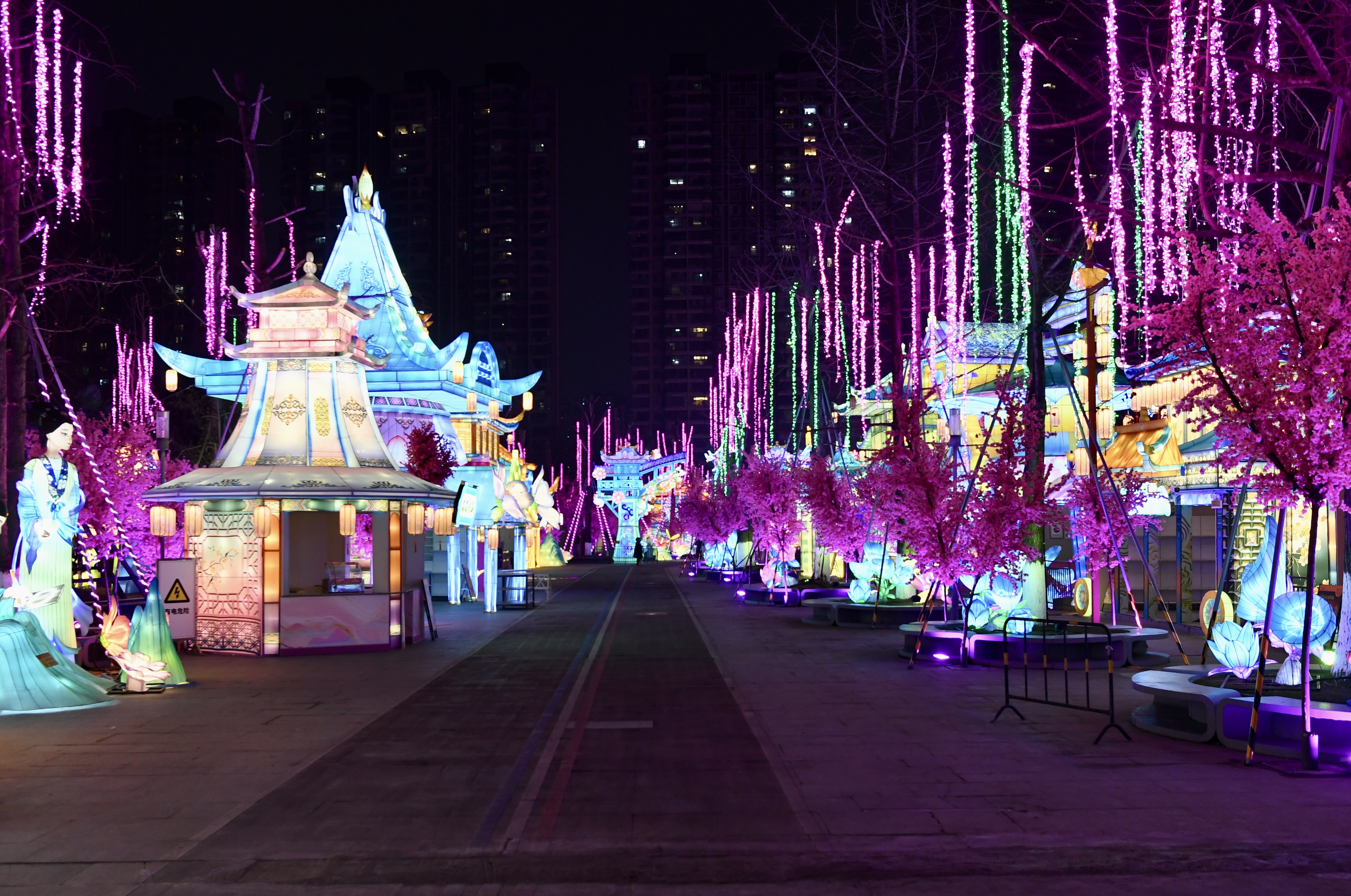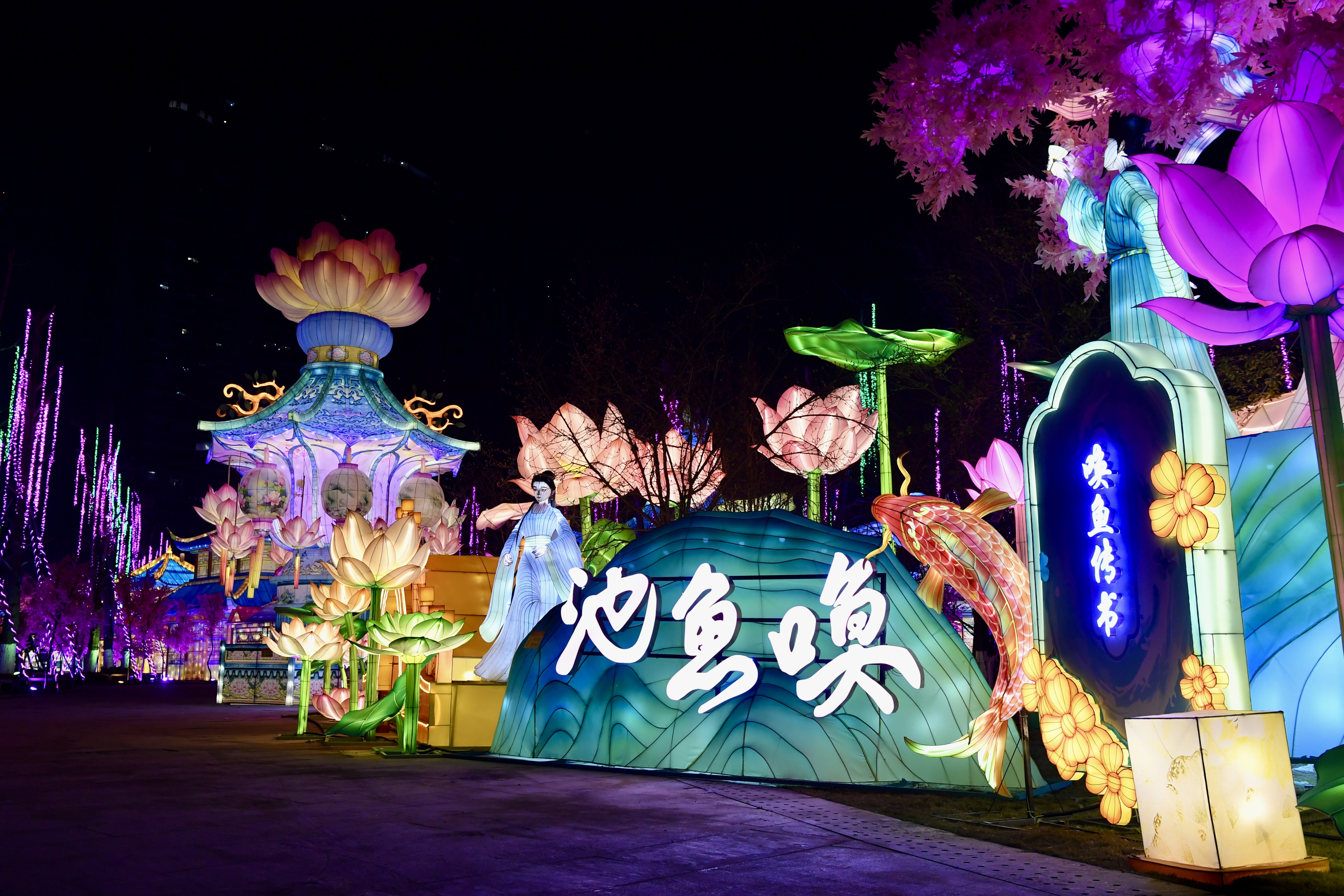第54届成都国际熊猫灯会暨首届江滩公园光影艺术展位于江滩公园核心区,占地约240亩,由“花重锦官城”“夜游锦江”“水润天府”“蜀里安逸”四大组团构成,将中华优秀传统文化与当代艺术设计相融合。以“创新创造”为核心主旨,本届灯会在中轴线打造灯市场景——“锦城年街”,将“花、灯、市、人”结合在一起,取材李白、杜甫、苏轼、陆游等历史人物以及成都历史文化典故,按照“春、夏、秋、冬”四季构建灯组场景,并植入传统非遗彩灯、新型光影装置等。
