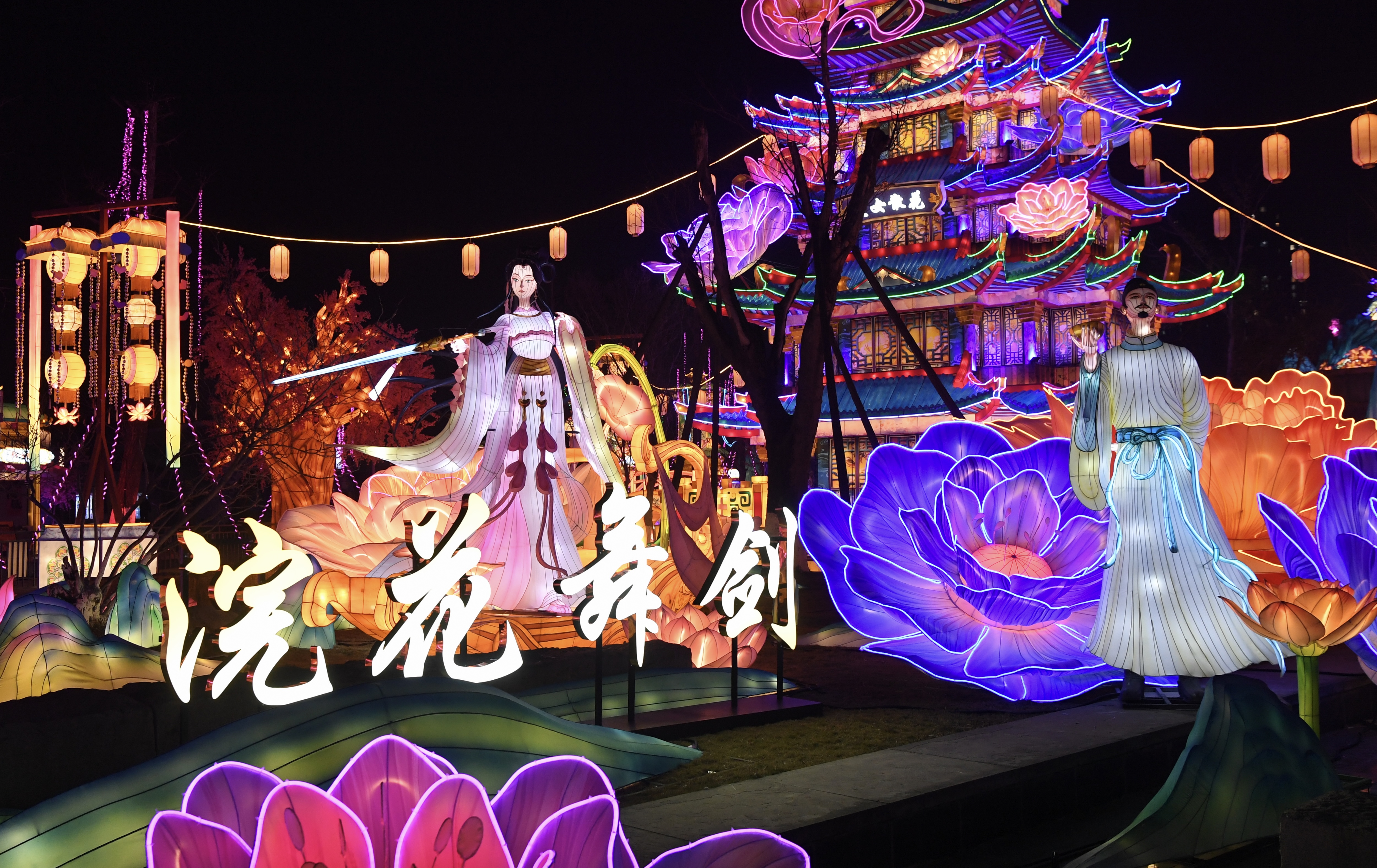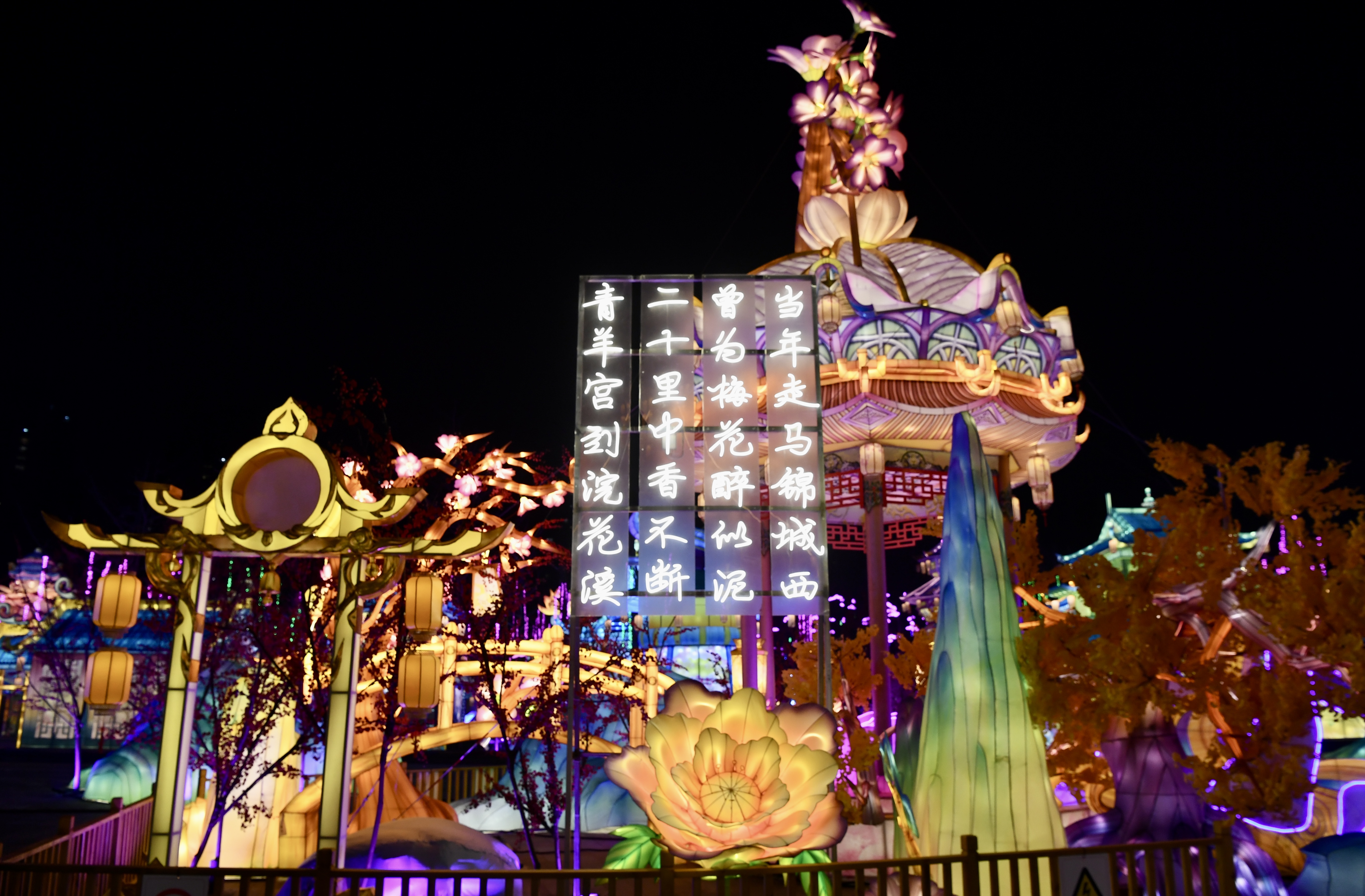 “浣花舞剑”灯组则再现了晚唐浣花夫人的飒爽英姿,漫步灯组间可以领略晚唐豪情与厚重历史。此外,以李白游成都时所写下的千古名句“九天开出一成都,万户千门入画图”为设计灵感的“诗仙挥毫”、以“天女散花”典故为灵感的“天女散花”和“诗圣寻花”(杜甫)、文君琴思(卓文君)、竹里风华(薛涛)、唤鱼传书(苏东坡与妻子王弗)、状元美眷(杨升庵及夫人黄峨)、放翁醉梅(陆游)等灯组,都为市民游客带来别样的文化体验。